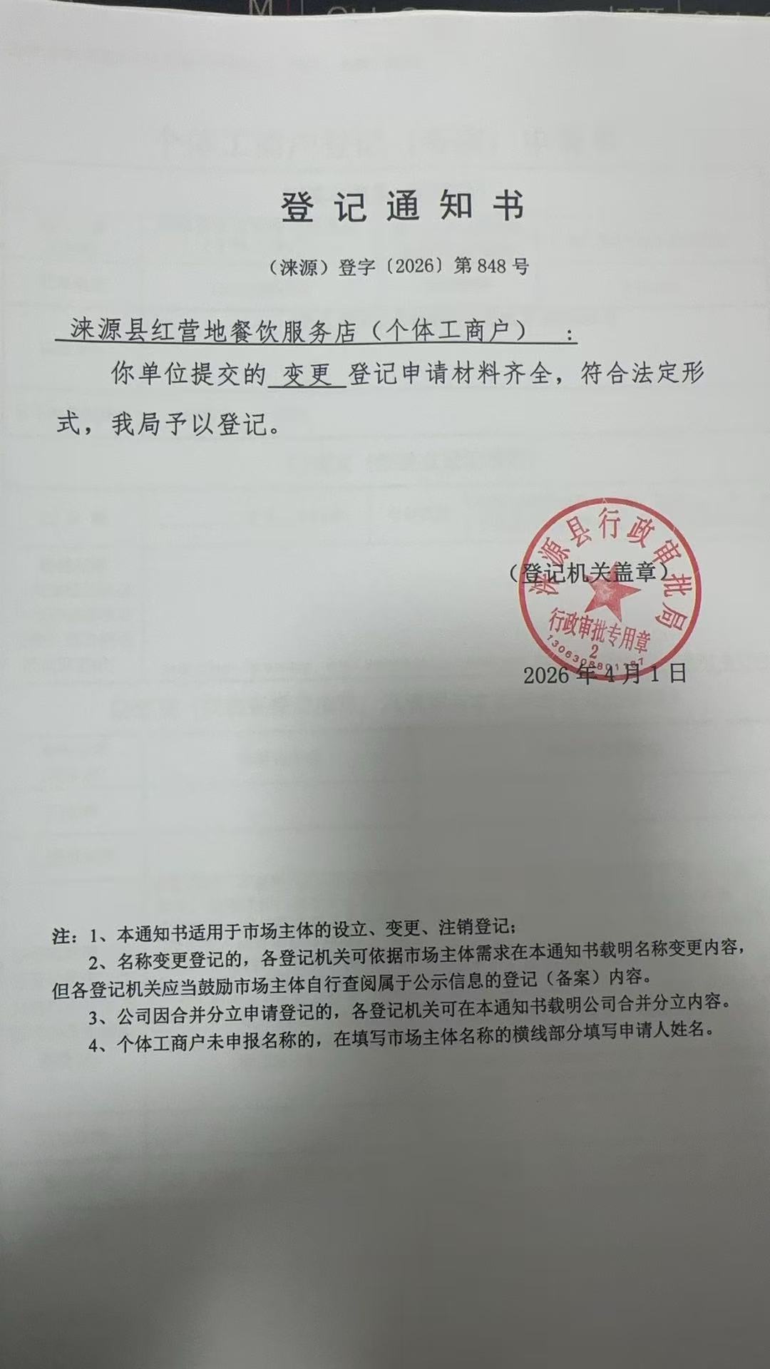 关于涞源县红营地餐饮服务店变更的公示