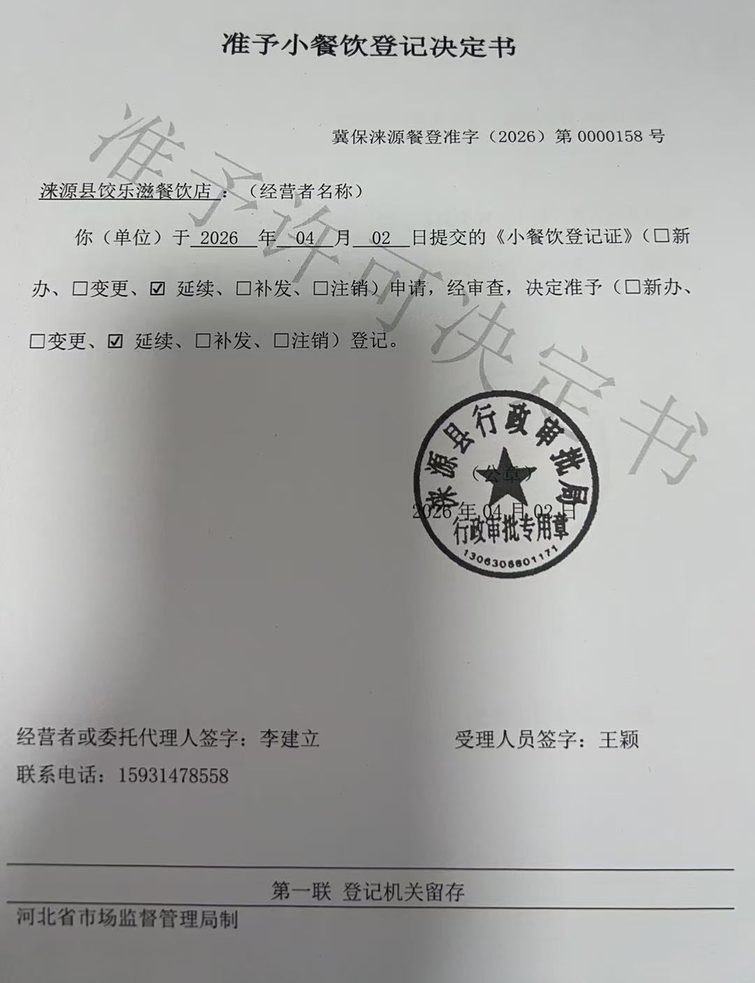 关于涞源县饺乐滋餐饮店准予食品小餐饮登记决定的公示