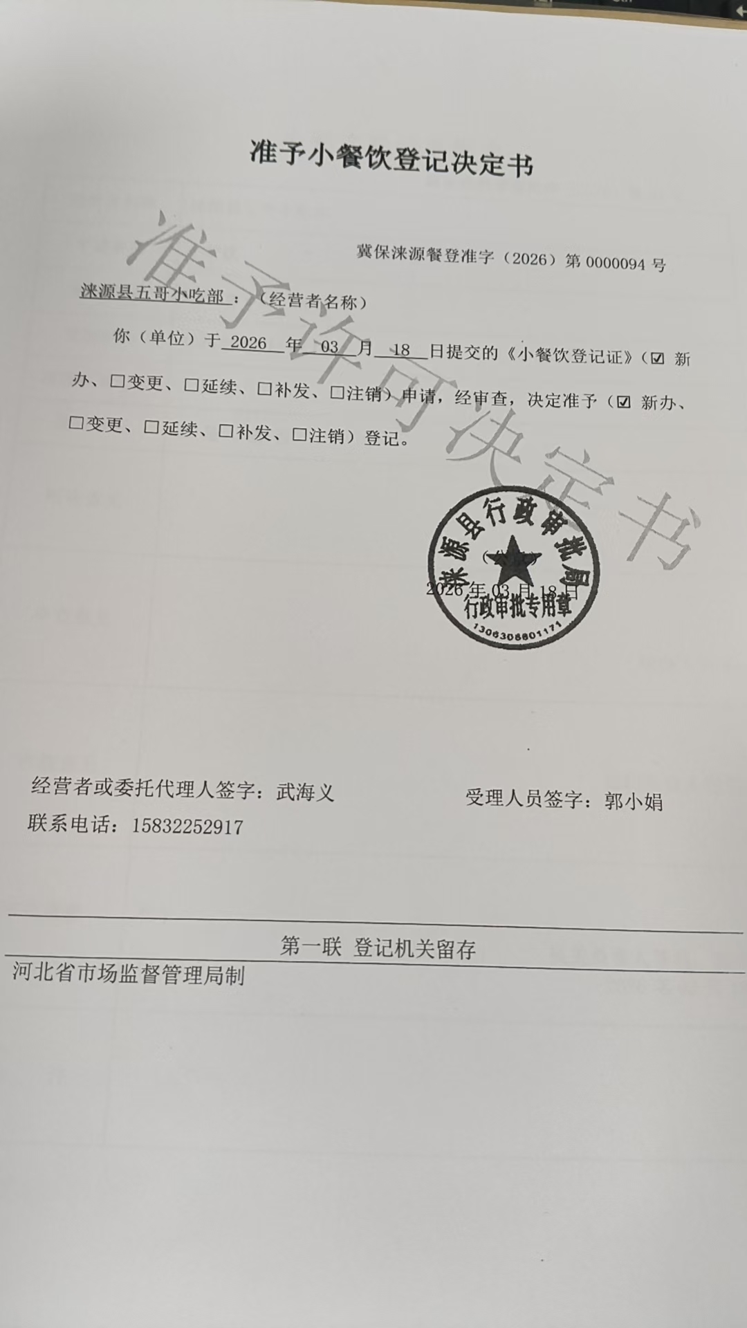 涞源县五哥小吃部准予小餐饮登记决定书.jpg