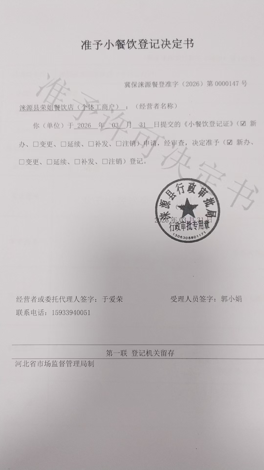 涞源县荣姐餐饮店准予小餐饮登记决定书.jpg