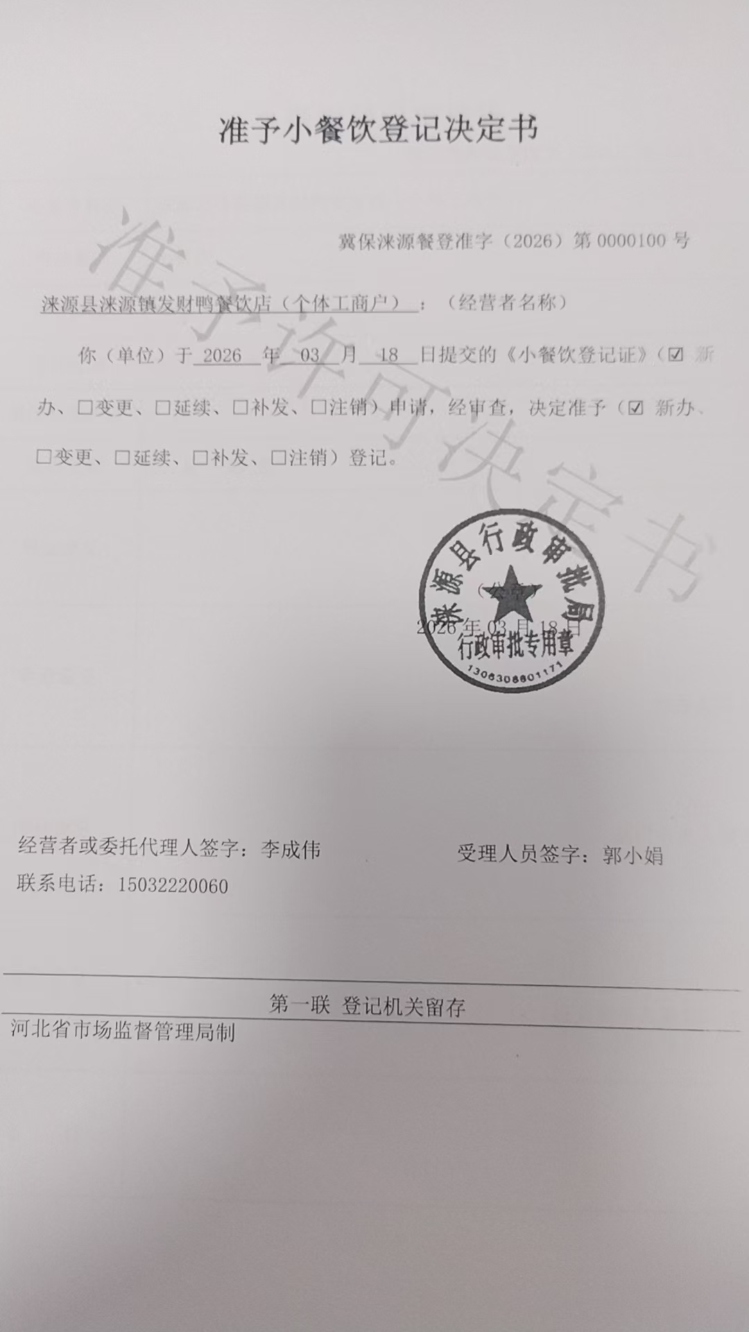 涞源县涞源镇发财鸭餐饮店准予小餐饮登记决定书.jpg