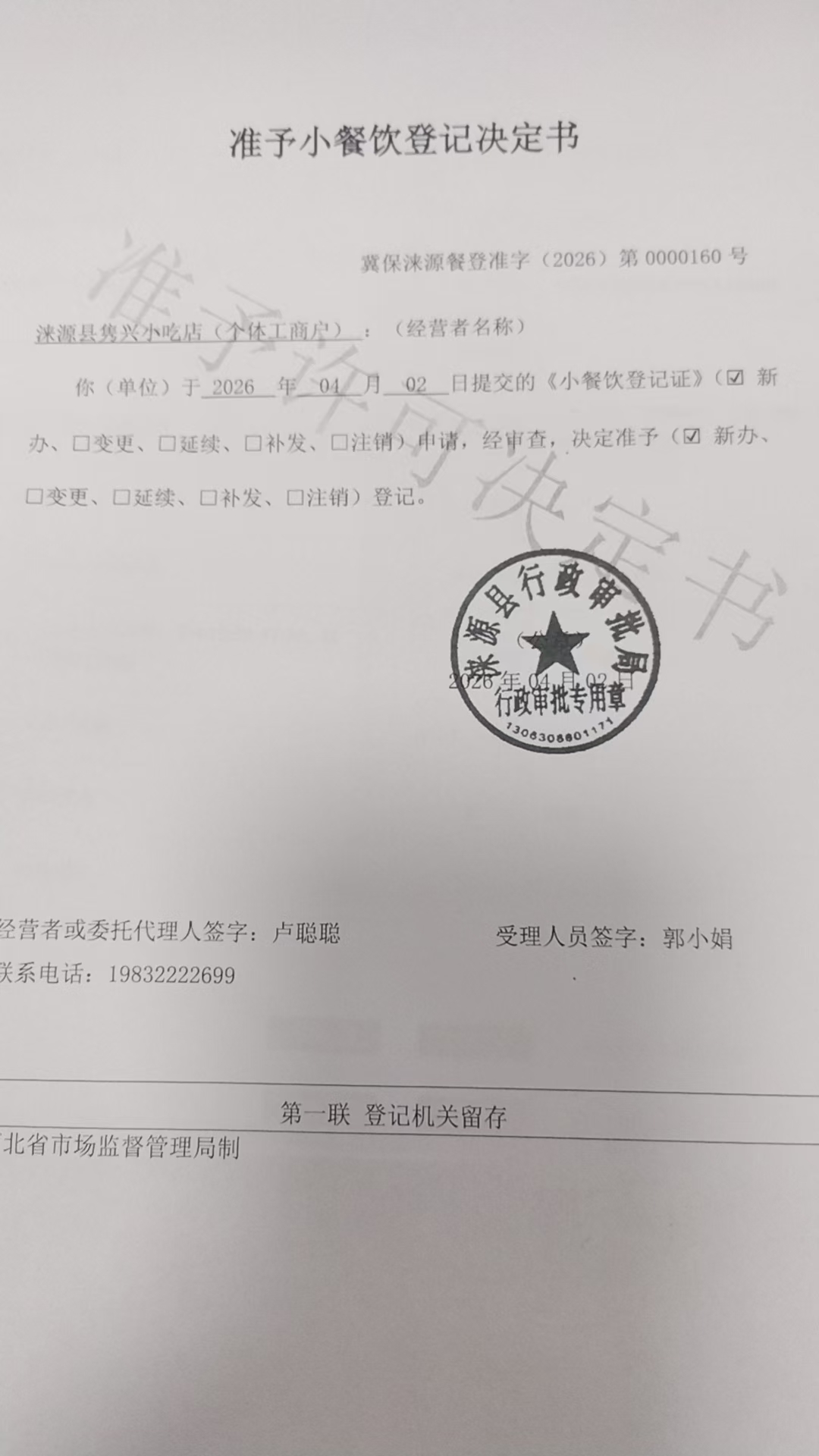 涞源县隽兴小吃店准予小餐饮登记决定书.jpg
