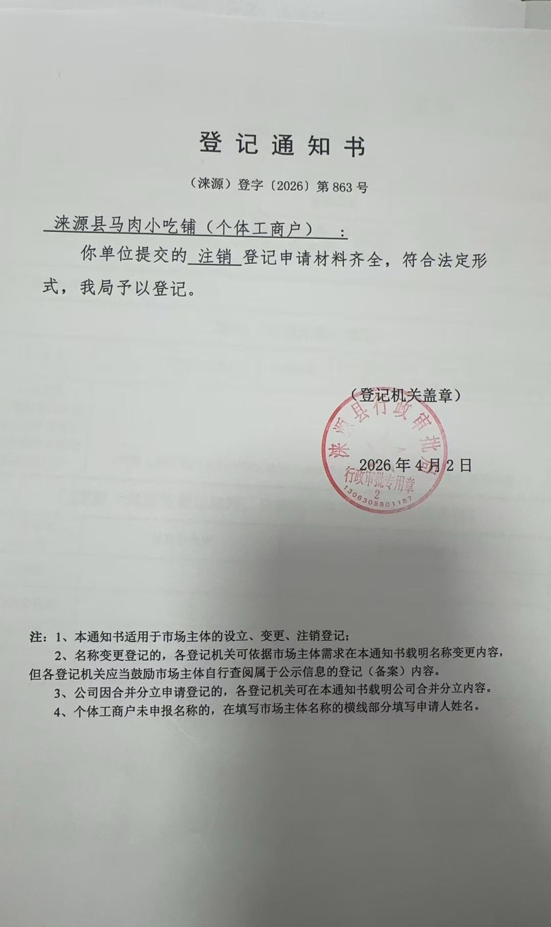 关于涞源县马肉小吃铺注销的公示