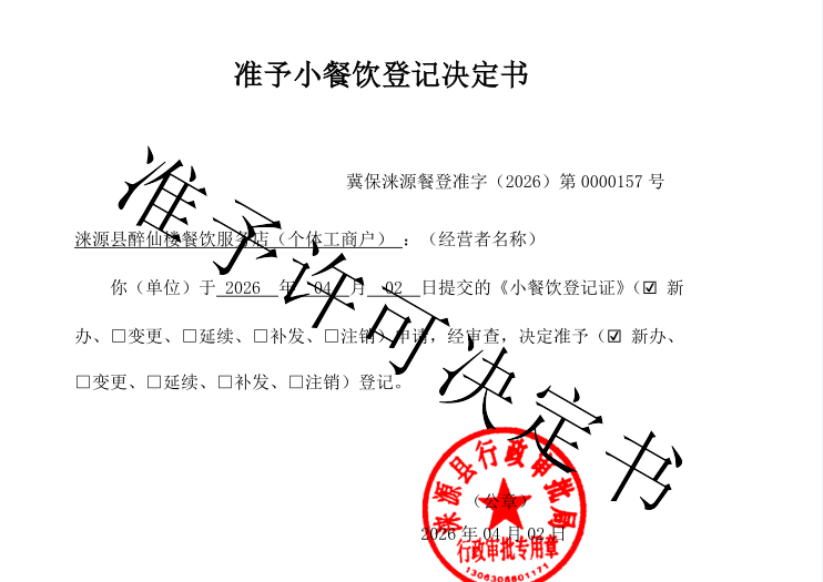 关于涞源县醉仙楼餐饮服务店行政许可的公示