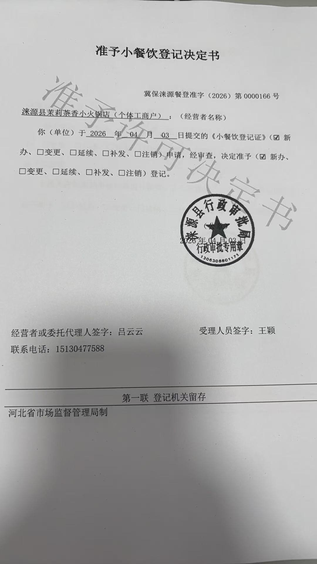 关于涞源县茉莉茶香小火锅店准予食品小餐饮登记决定的公示