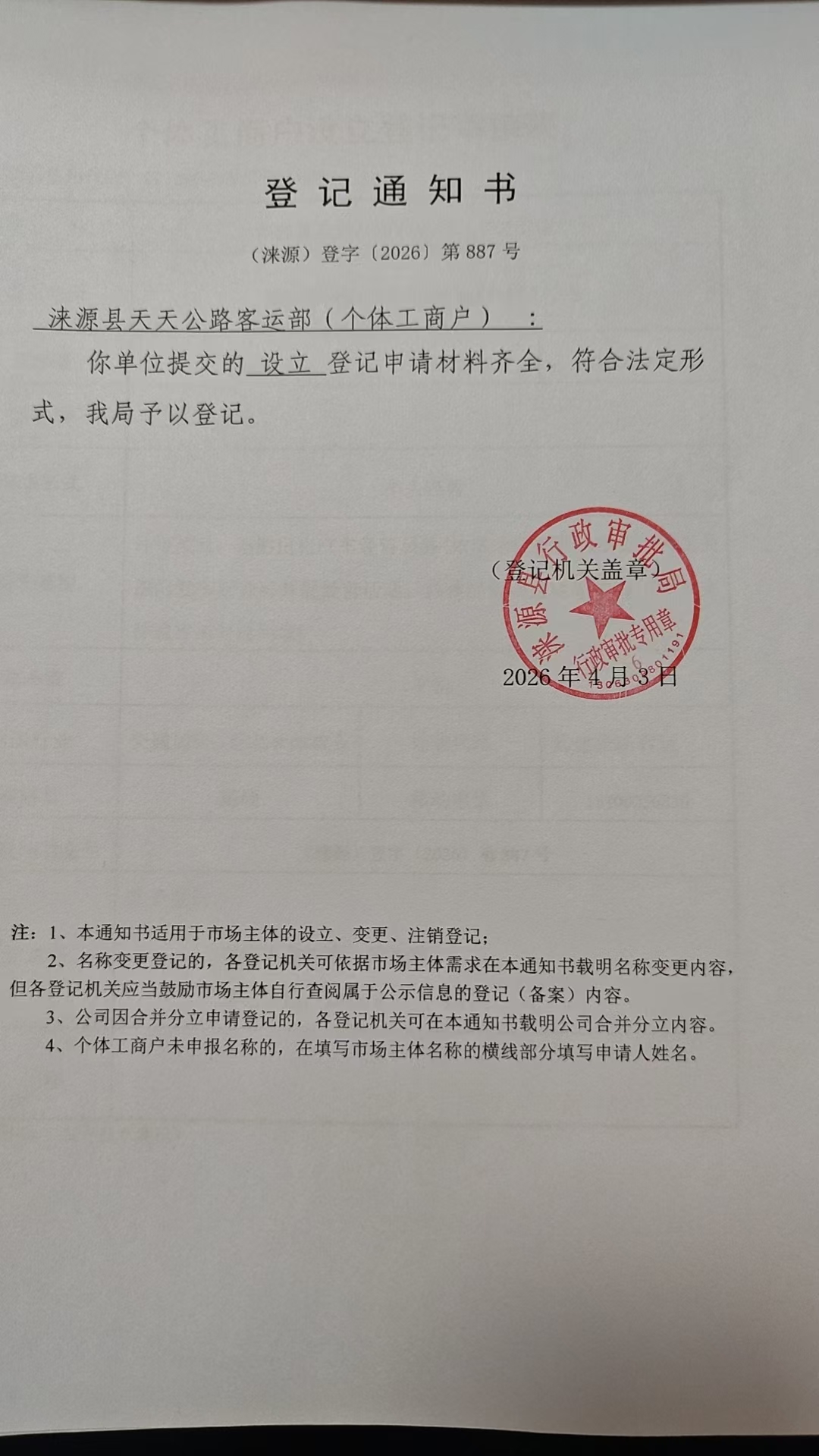 关于涞源县天天公路客运部设立的公示