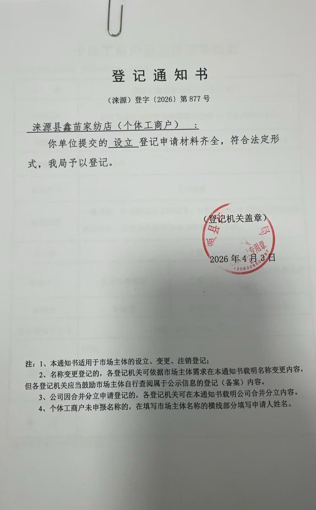 关于涞源县鑫苗家纺店设立的公示