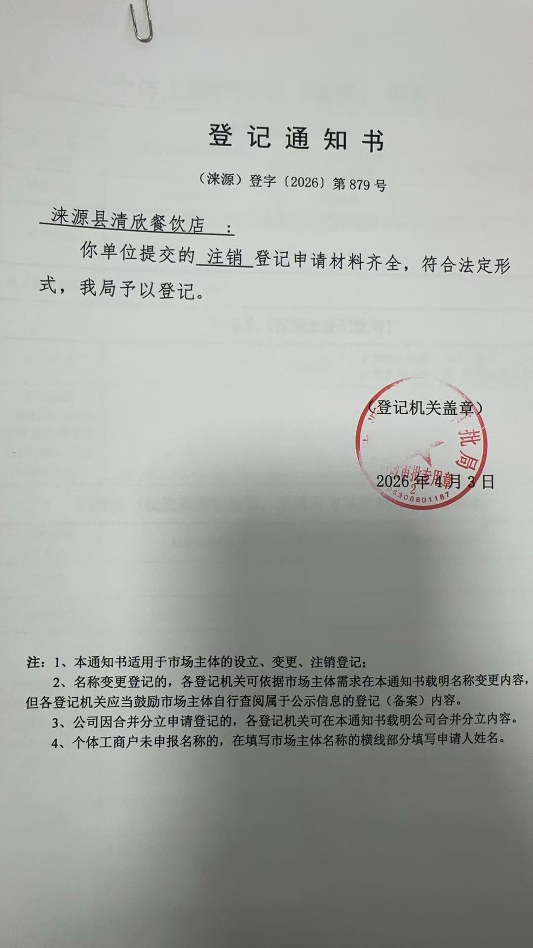 关于涞源县清欣餐饮店注销的公示