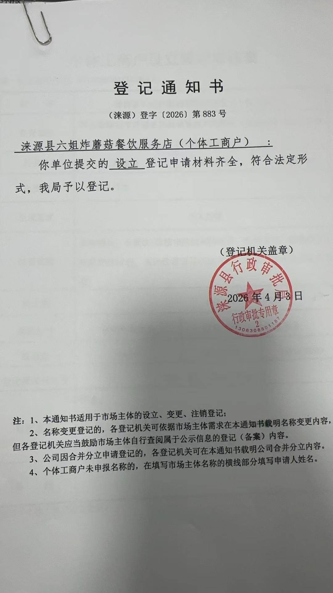 关于涞源县六姐炸蘑菇餐饮服务店设立的公示