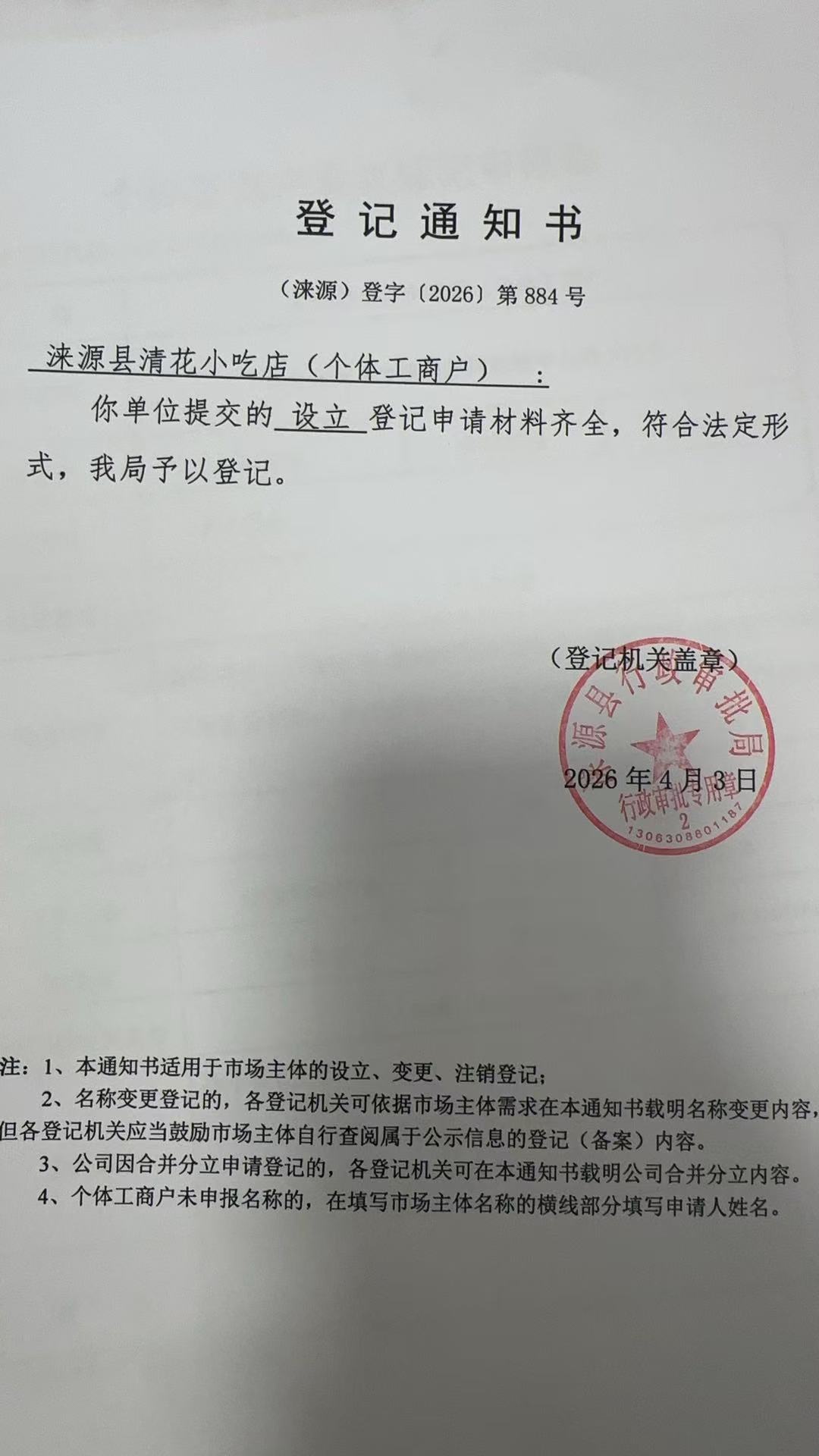 关于涞源县清花小吃店设立的公示