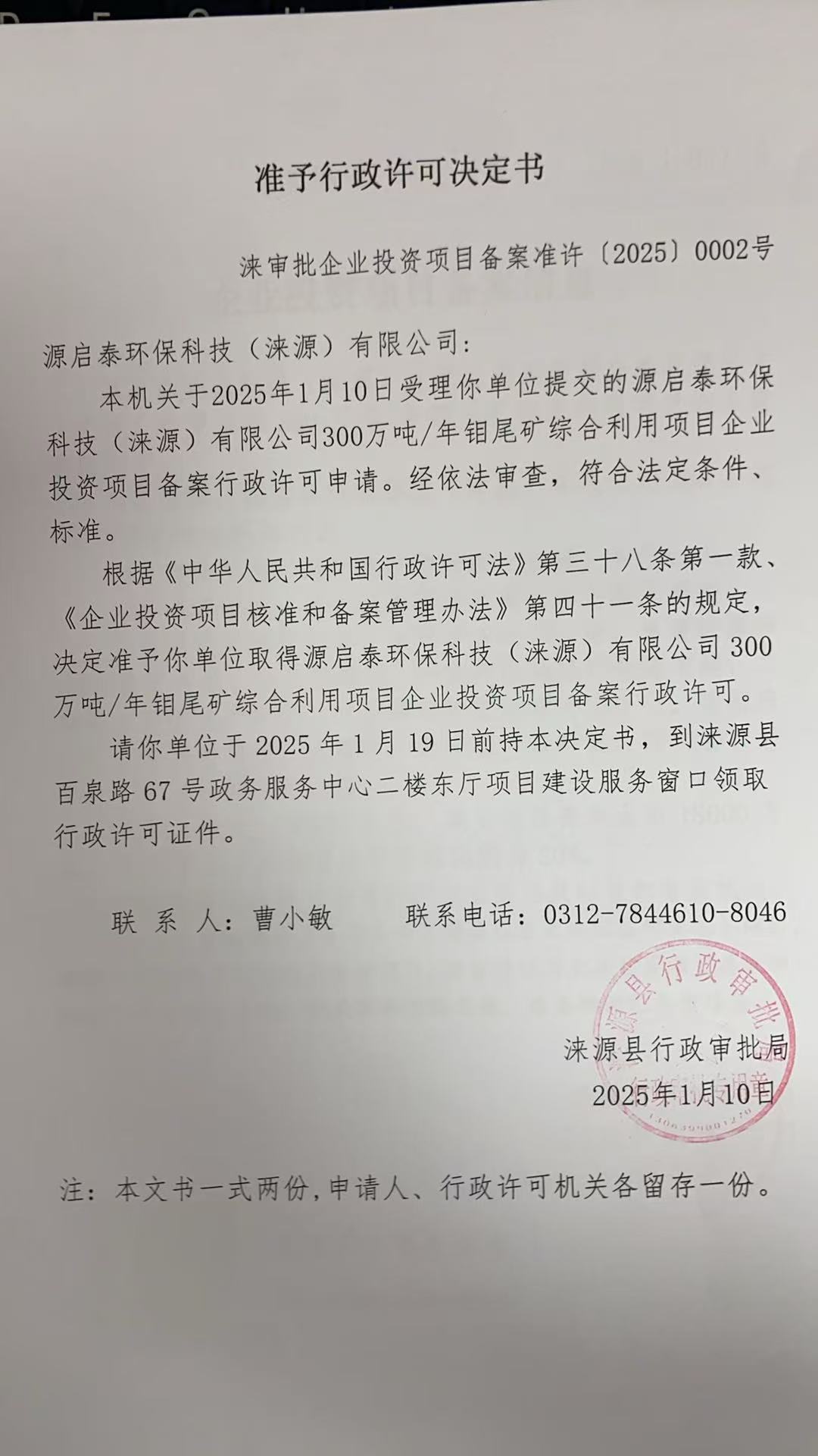 关于源启泰环保科技(涞源)有限公司企业投资项目备案的公示