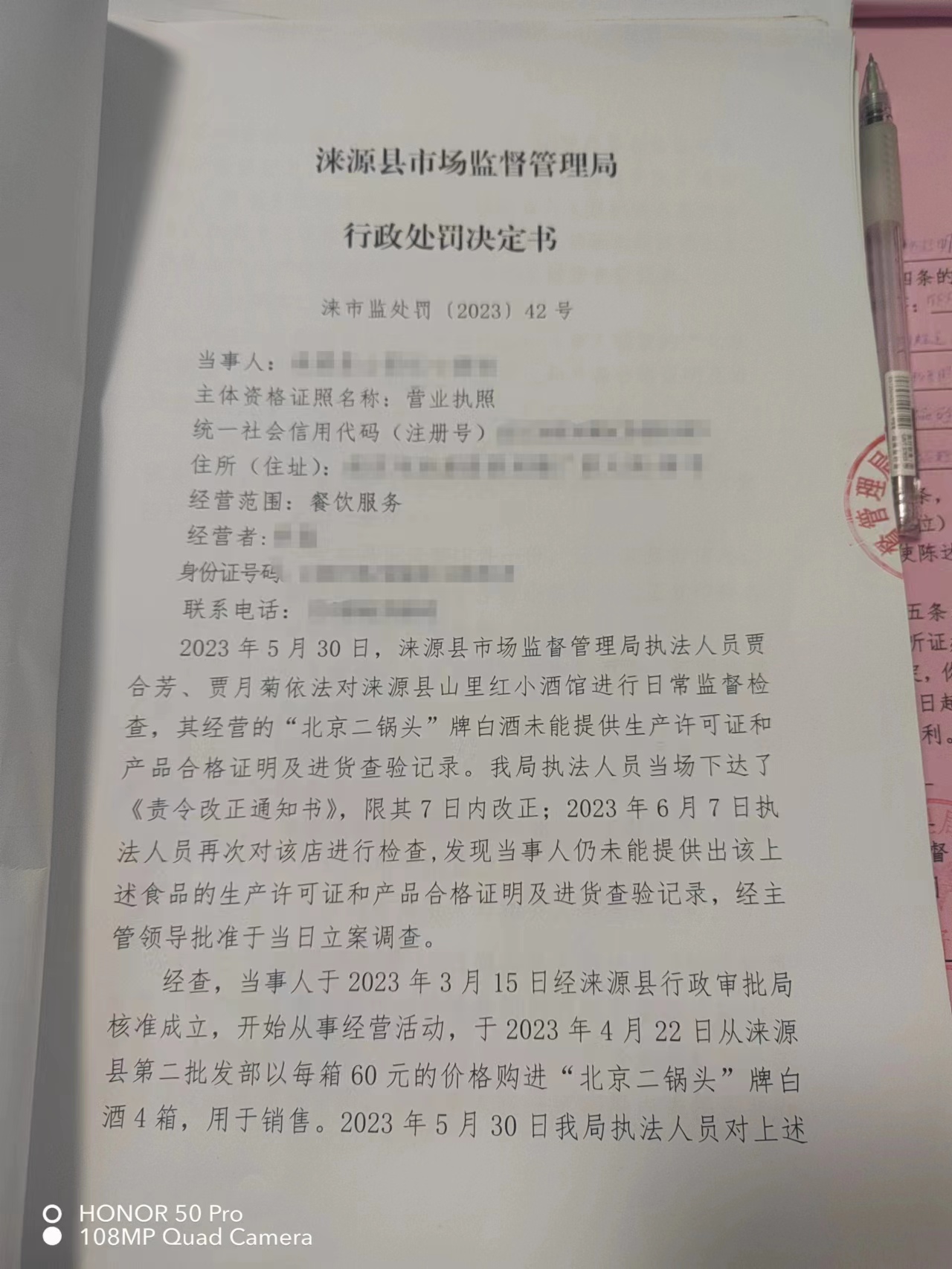 涞市监处罚〔2023〕42号涞源县山里红小酒馆购进食品未按规定建立进货查验记录制度案