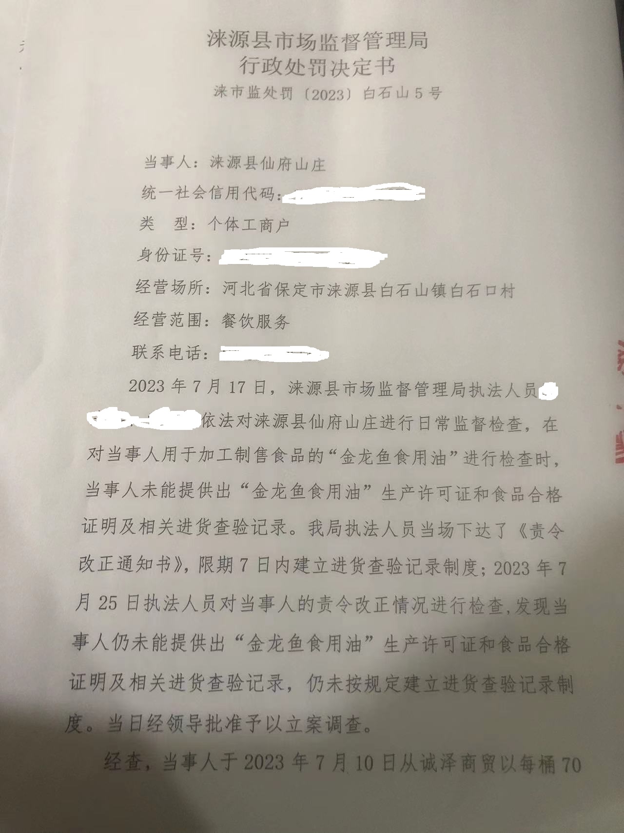 涞市监处罚 〔2023〕白石山5号涞源县仙府山庄购进食品未按规定建立进货台账查验记录制度案