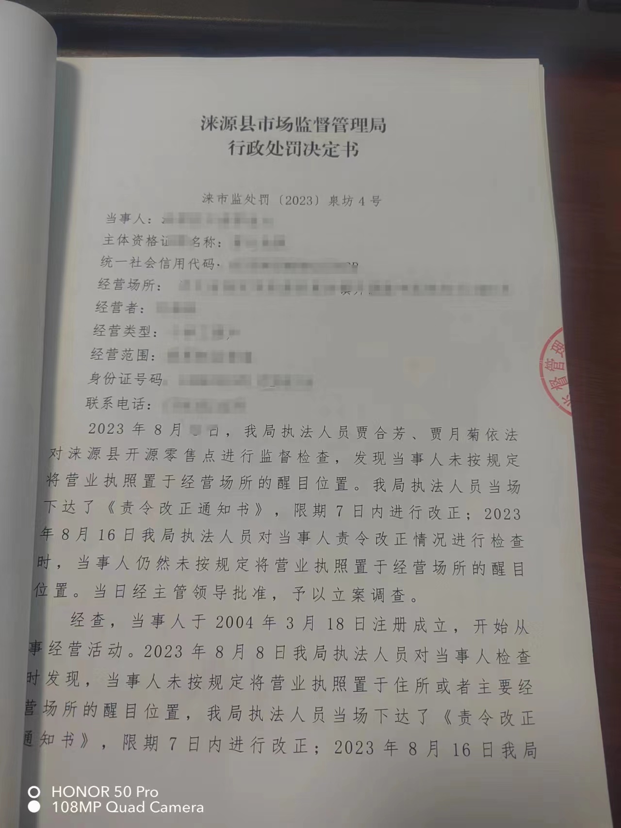 涞市监〔2023〕泉坊4号涞源县开源零售点 从事经营活动未将营业执照置于经营场所醒目位置案