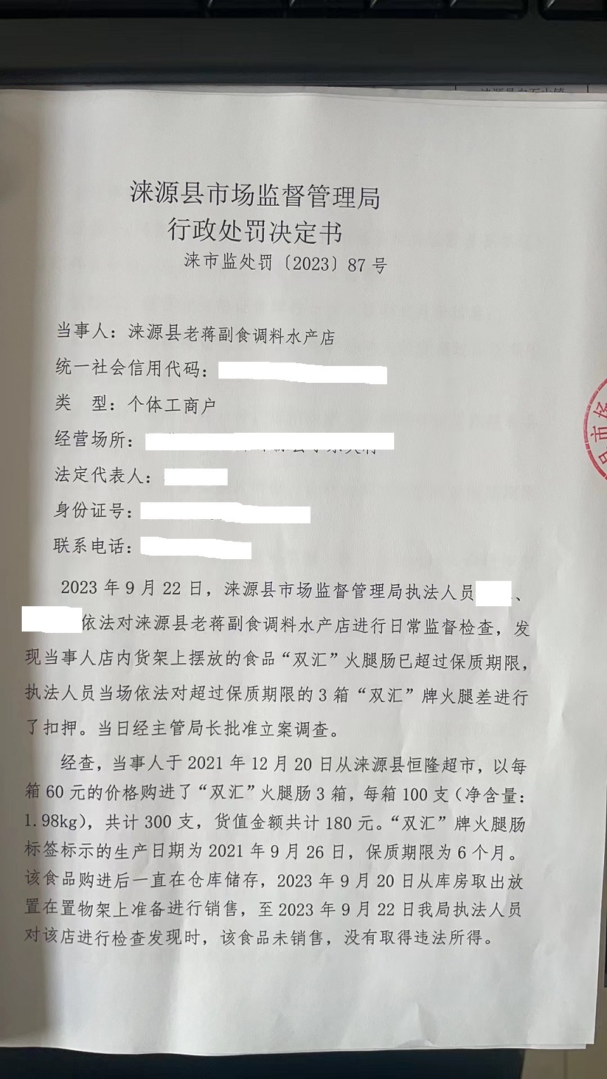 涞市监处罚〔2023〕87号涞源县老蒋副食调料水产店涉嫌经营超过保质期限食品案