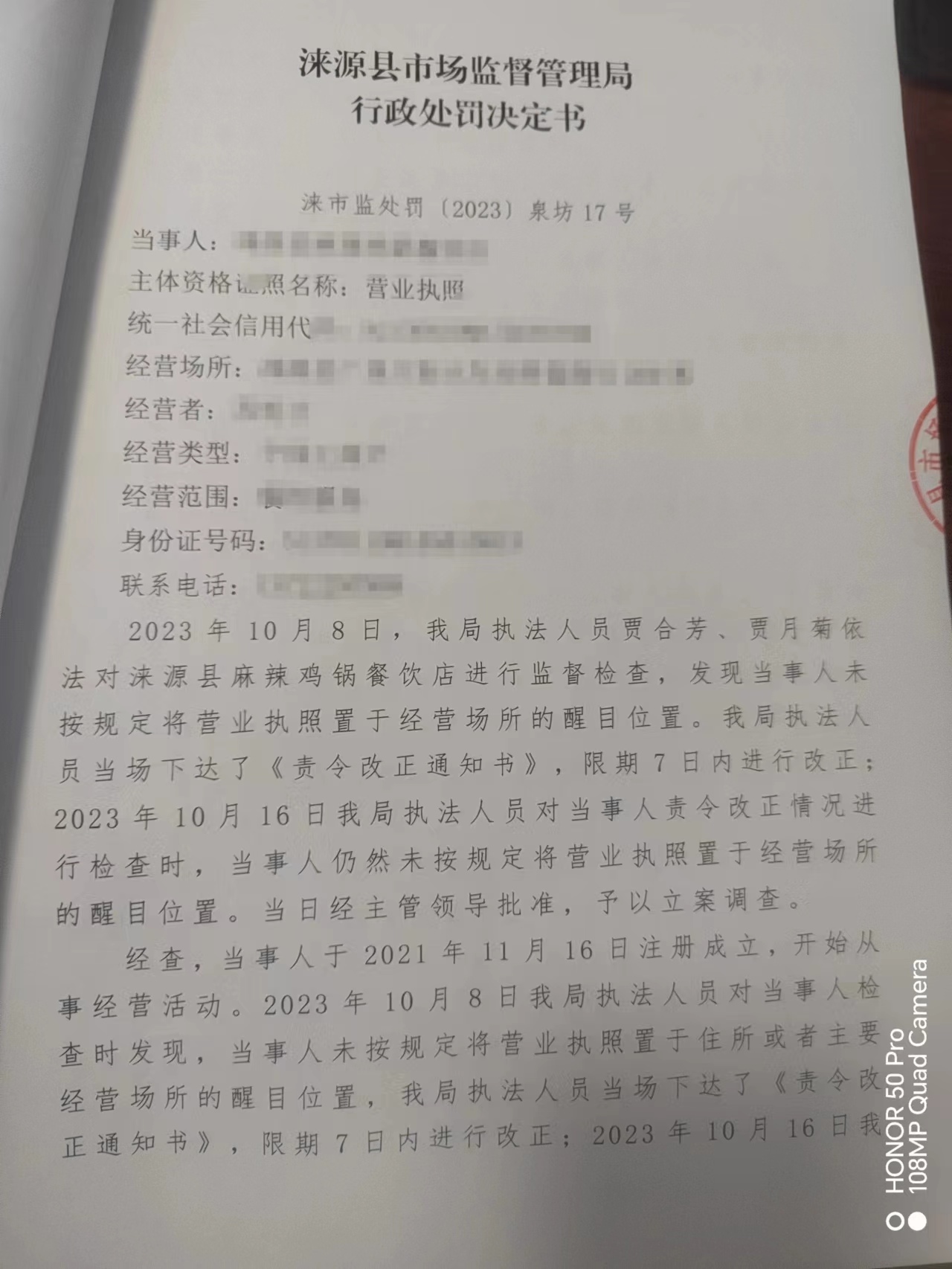 涞市监 〔2023〕泉坊17号涞源县麻辣鸡锅餐饮店从事经营活动未将营业执照置于经营场所醒目位置案