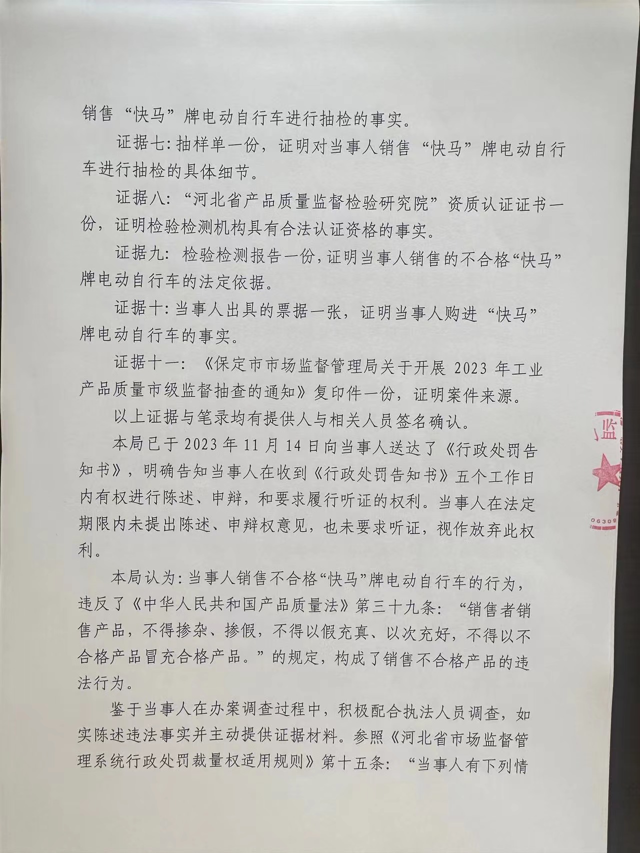 涞市监处罚〔2023〕93号涞源县保军机动车维修服务店 销售不合格电动自行车案
