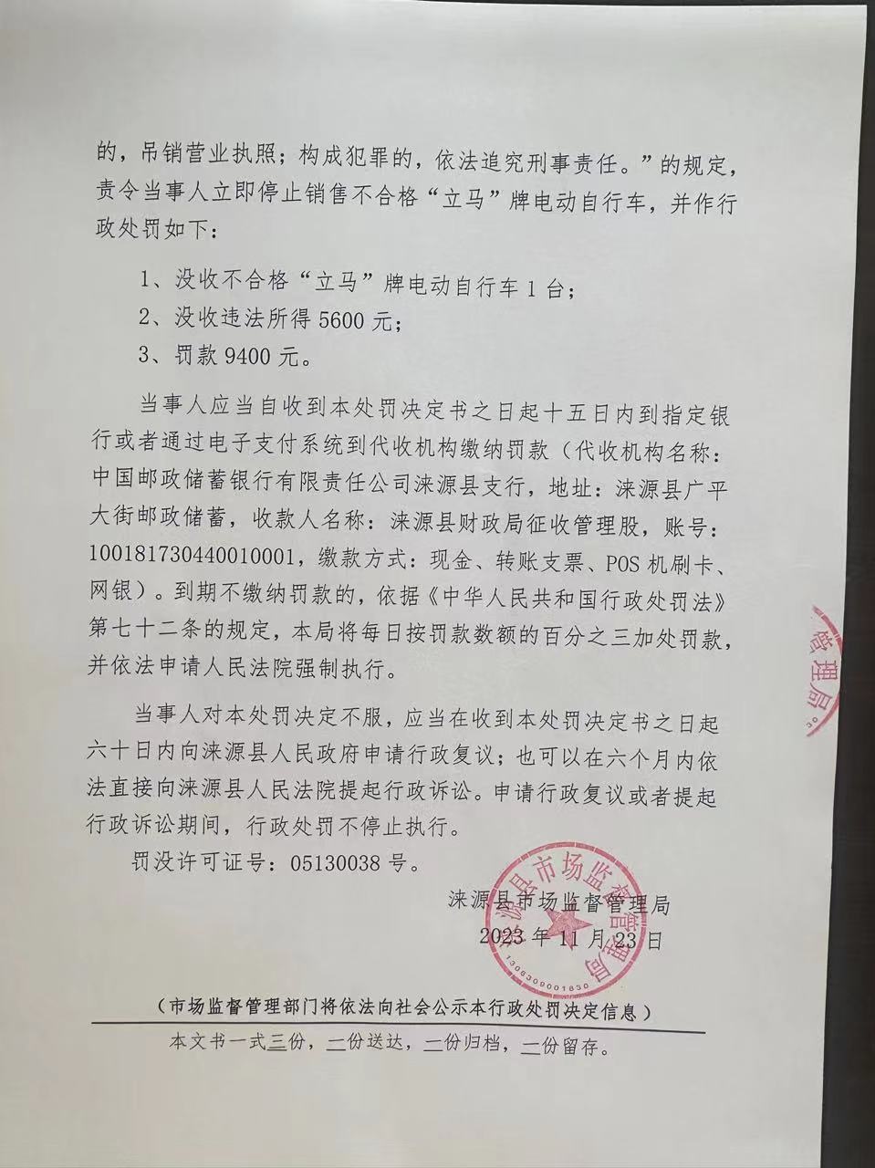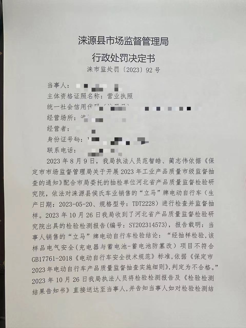 涞市监处罚〔2023〕92号 涞源县侯氏车业销售不合格“立马”牌电动自行车案