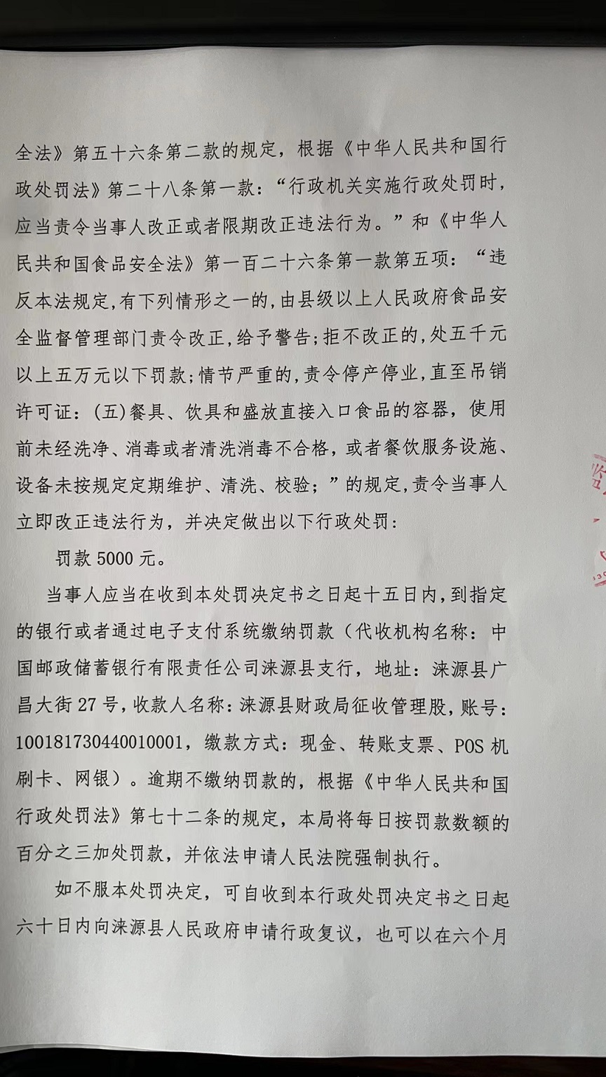 涞市监处罚〔2024〕食2号涞源县天外村未按照要求对餐具、饮具进行清洗消毒案