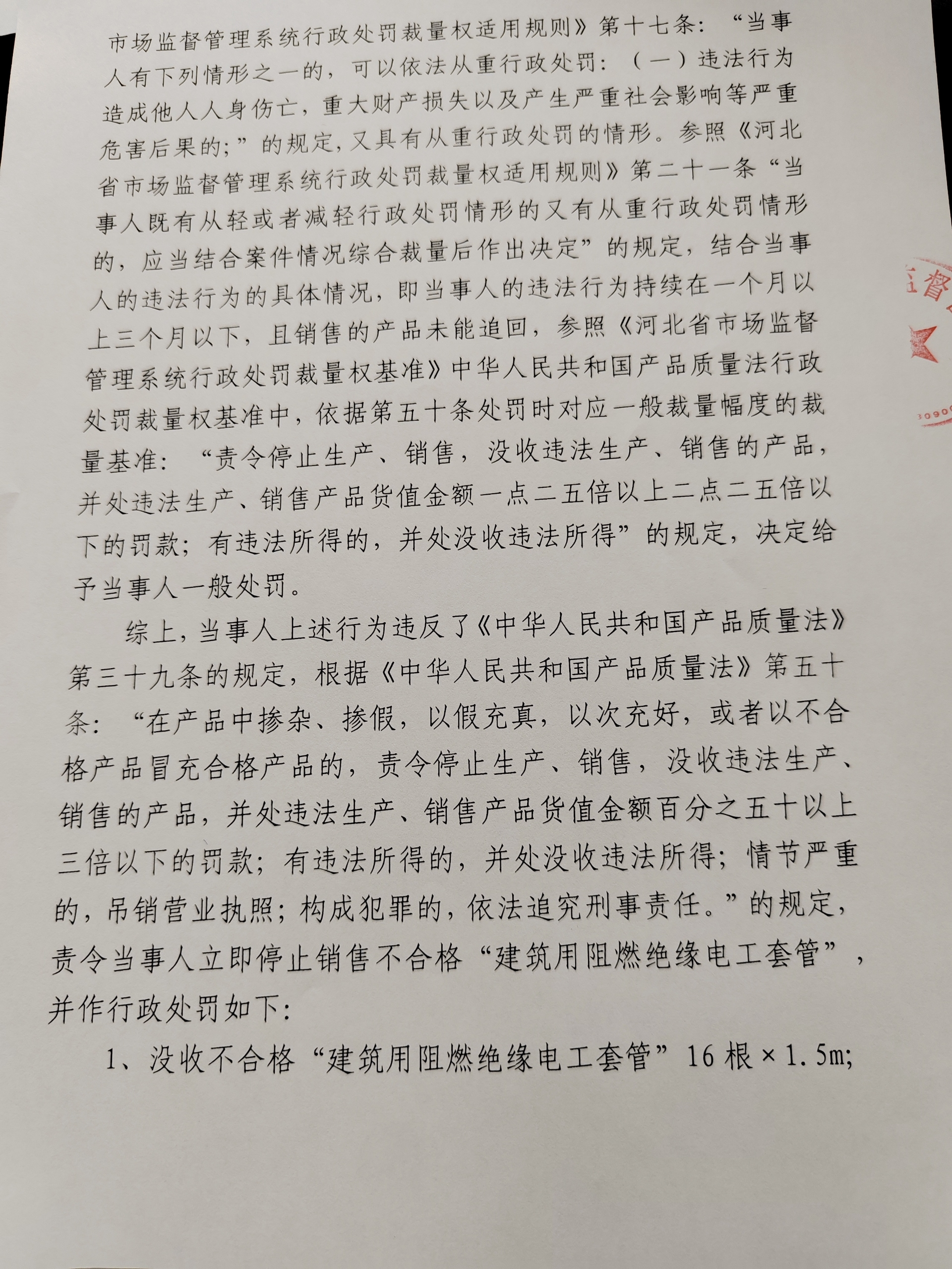 涞市监处罚〔2024〕质量1号,涞源县兴基五金建材批发部销售不合格“建筑用阻燃绝缘电工套管”案