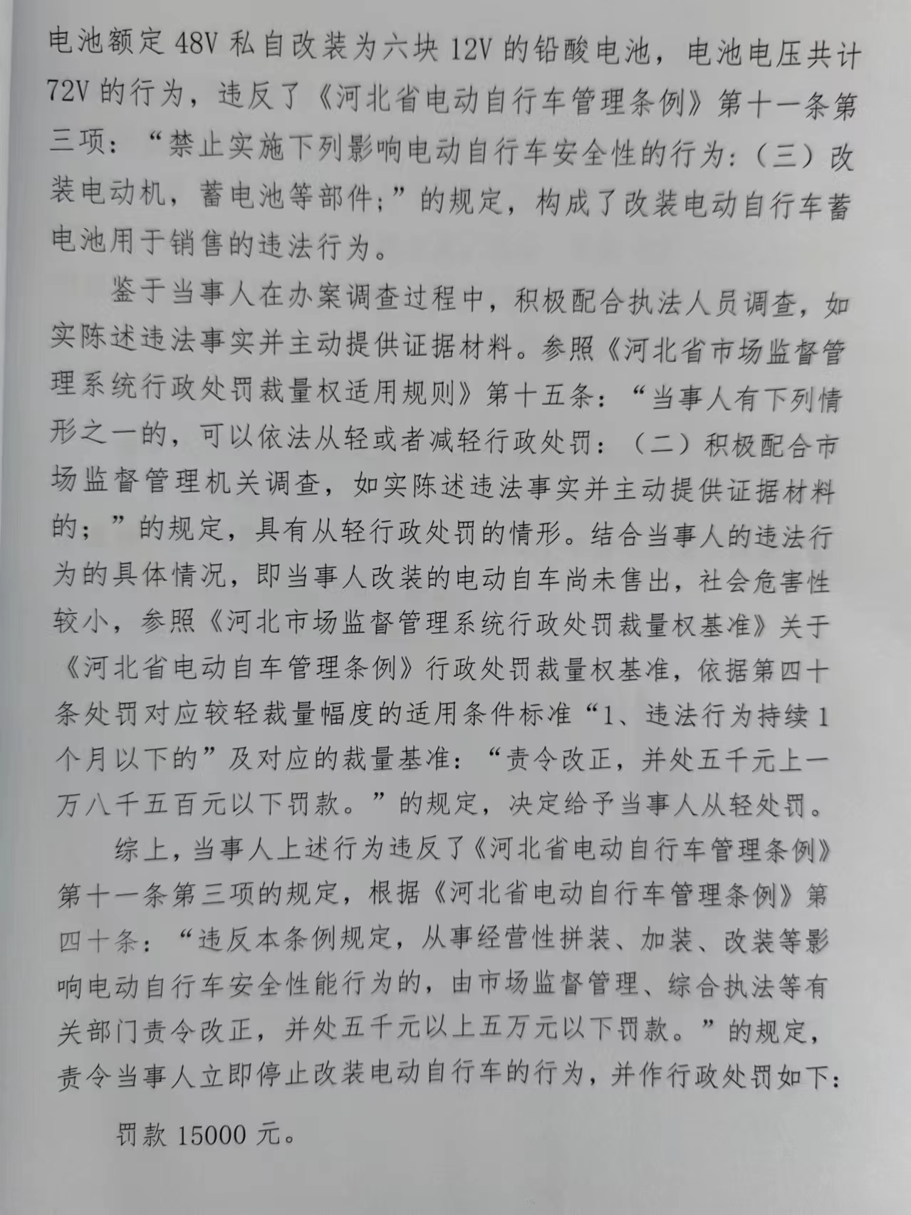 涞市监处罚 〔2024〕39号涞源县驰骋车行改装电动自行车蓄电池用于销售案