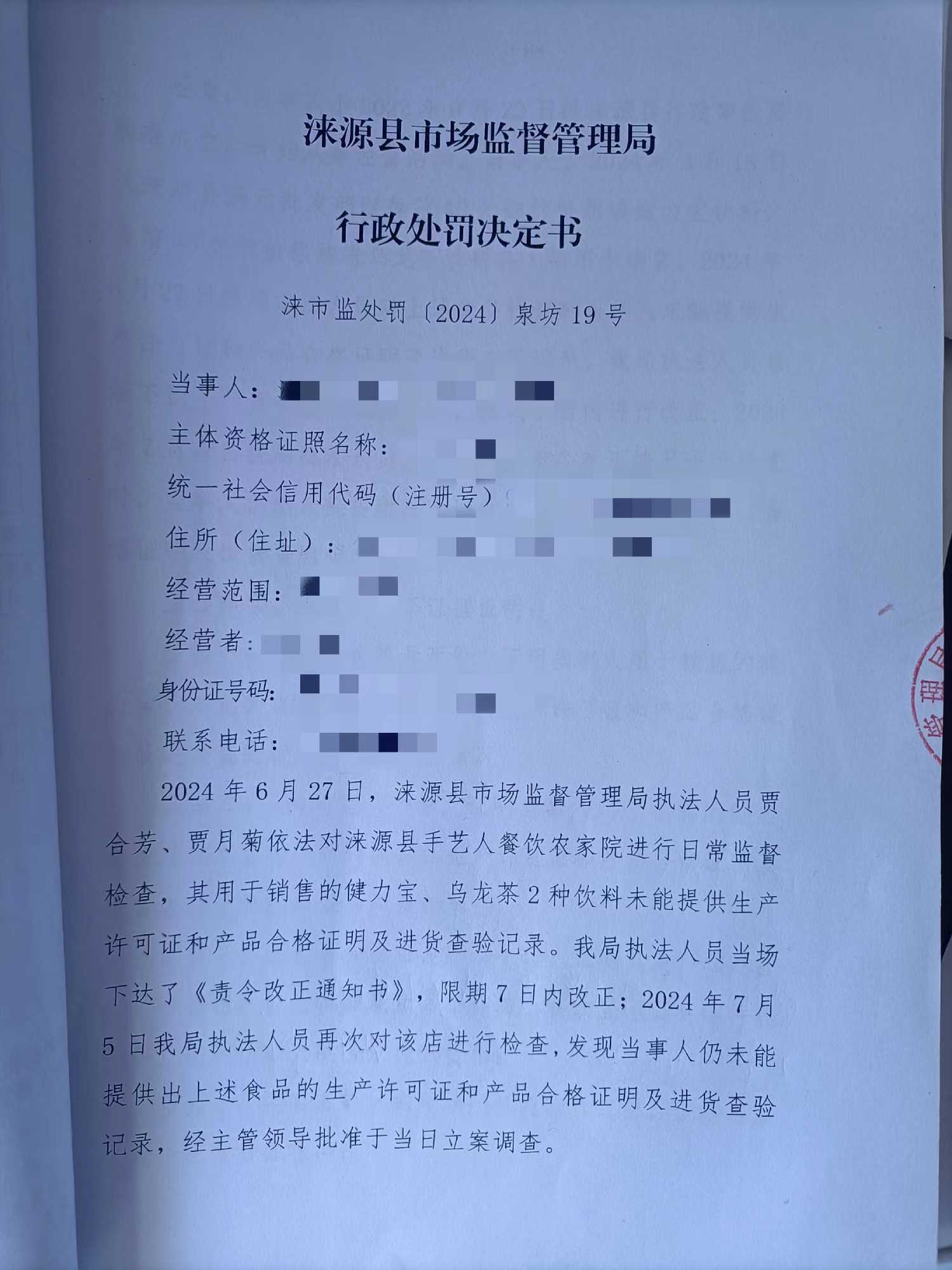 涞市监处罚〔2024〕泉坊19号涞源县手艺人餐饮农家院购进食品未按规定建立进货查验记录制度案
