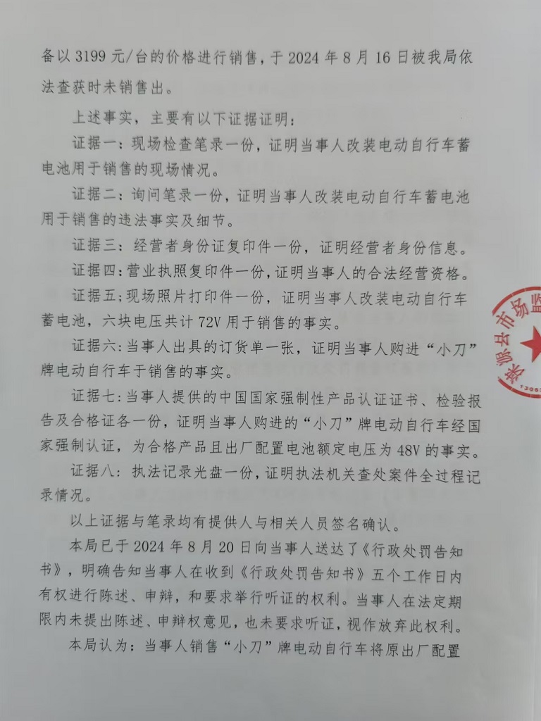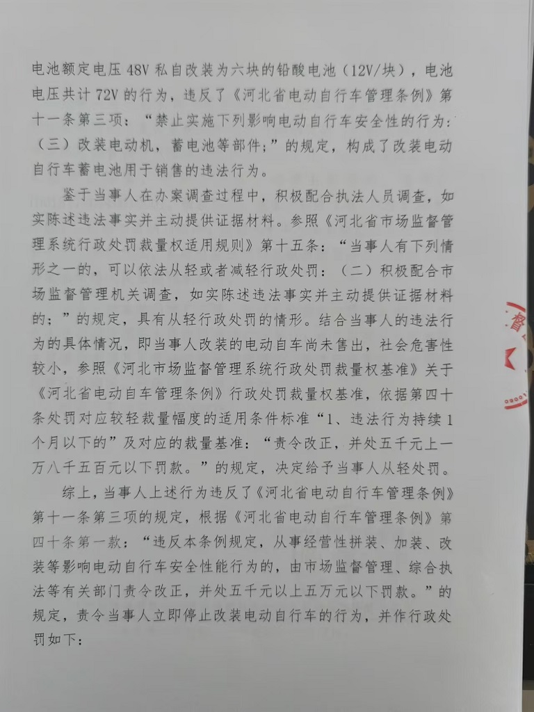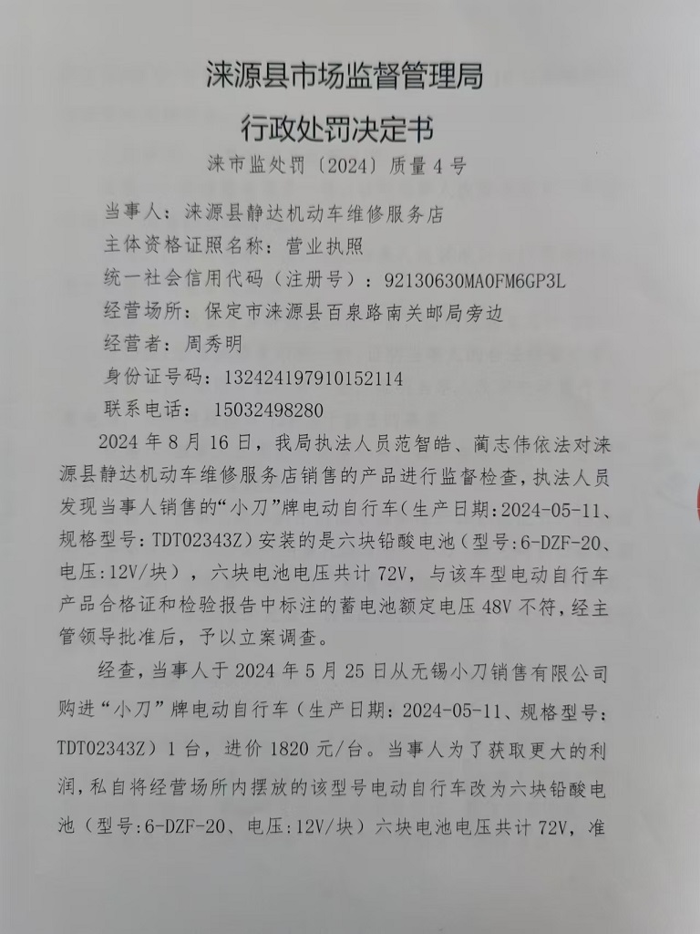 涞市监处罚〔2024〕质量4号 涞源县静达机动车维修服务店改装电动自行车蓄电池用于销售案
