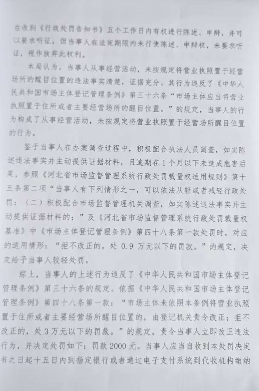 涞市监处罚〔2024〕城区34号涞源县嘉宝五金建材城未按规定将营业执照置于经营场所的醒目位置案