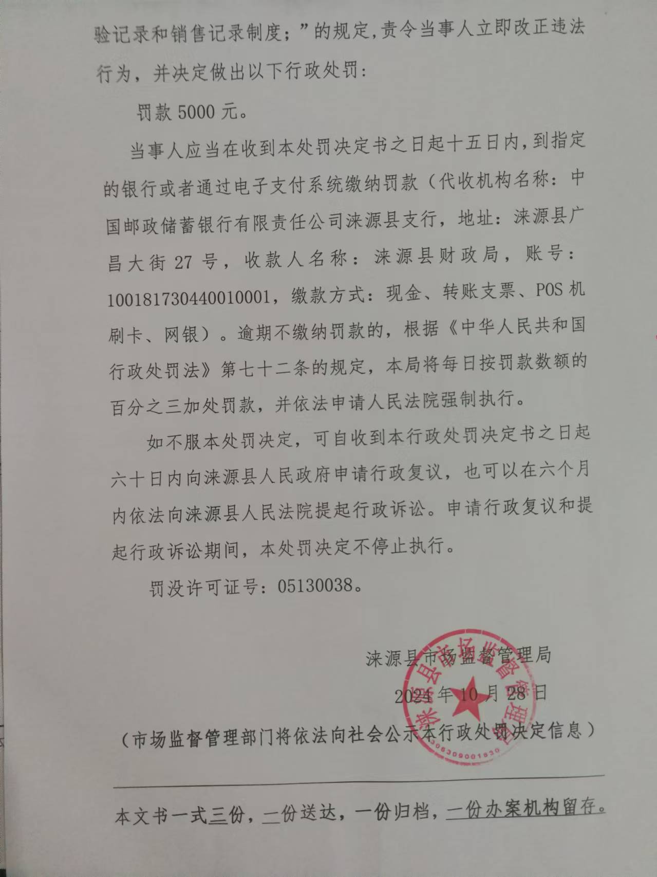 涞市监处罚〔2024〕白石山19号涞源县三仁和顺购进食品未按规定查验供货者许可证和合格证明文件案
