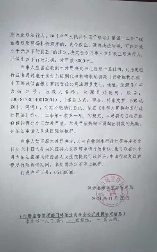 涞市监处罚〔2024〕泉坊40号涞源县小壮果蔬店未按规定明码标价案
