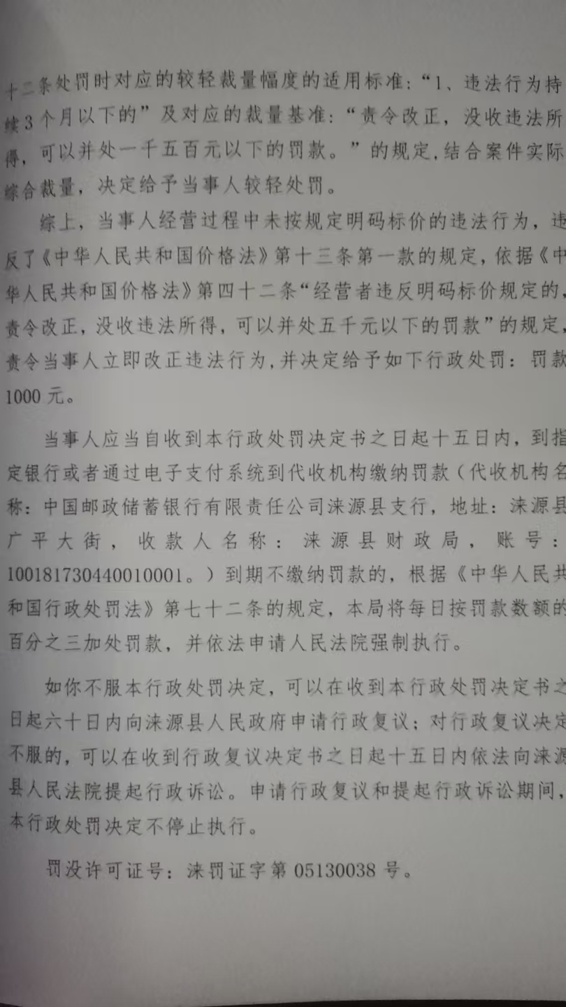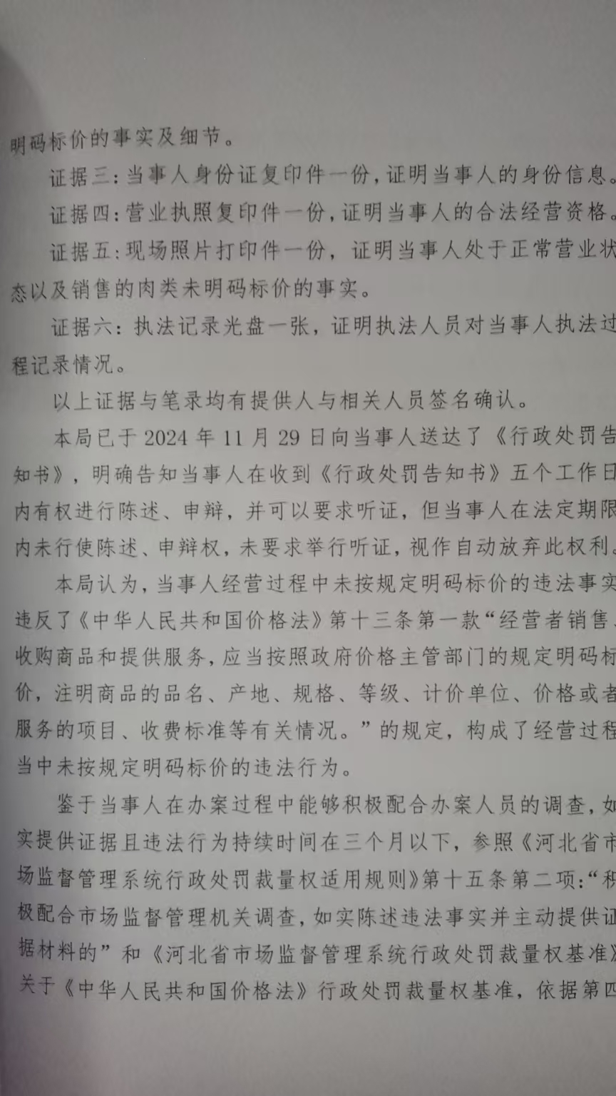 涞市监处罚〔2024〕银坊13号涞源县小伟肉类销售摊未按规定明码标价案