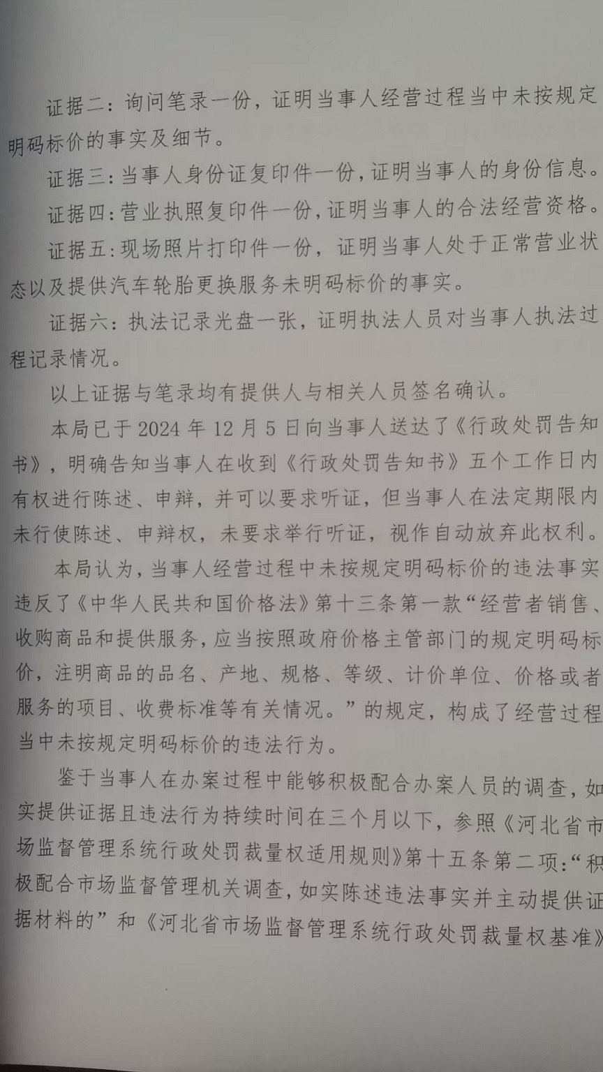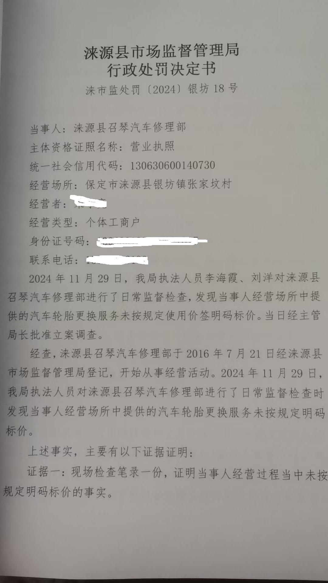 涞市监处罚〔2024〕银坊18号涞源县召琴汽车修理部涉嫌未按规定明码标价案