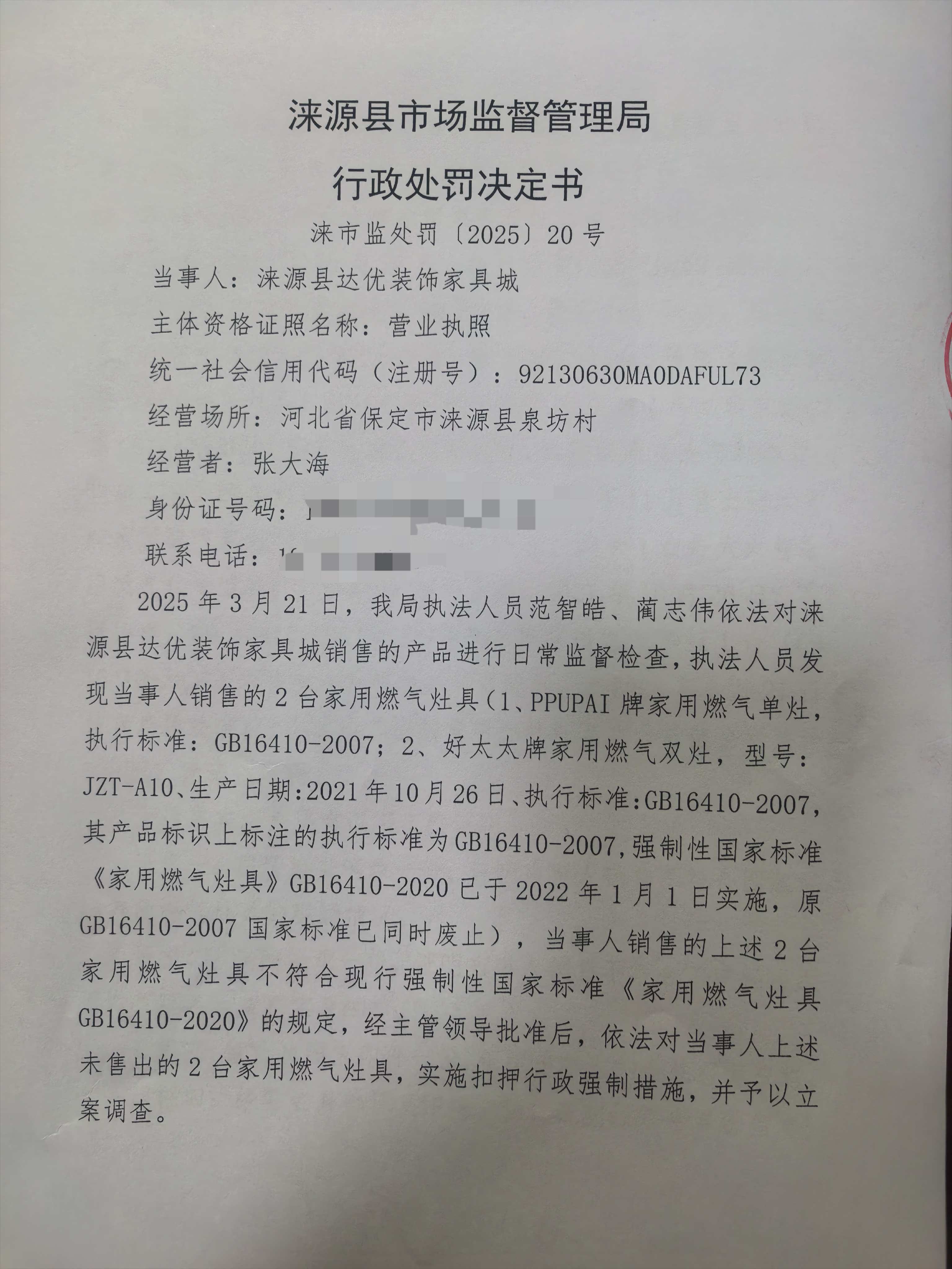 涞市监处罚〔2025〕20号 涞源县达优装饰家具城销售不符合国家标准的家用燃气灶具案