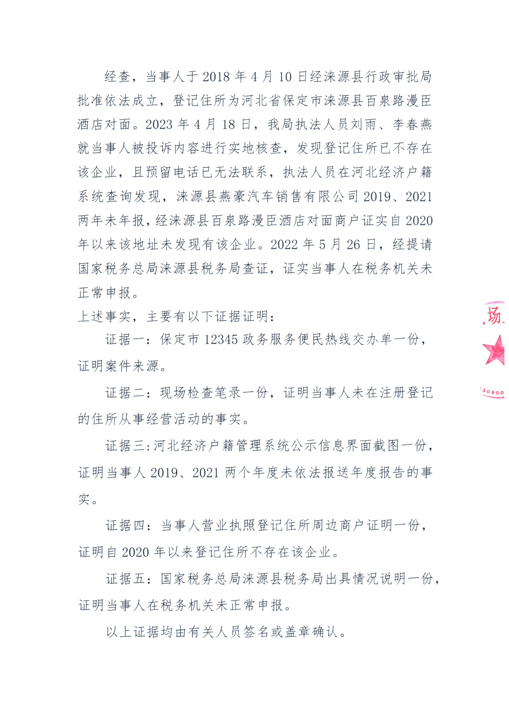 涞源县市场监督管理局关于拟吊销涞源县燕豪汽车销售有限公司营业执照行政处罚告知的公告