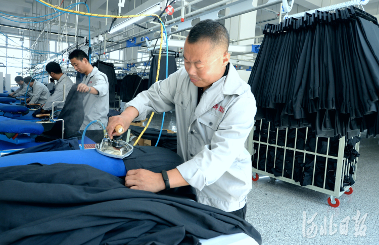 近日,位于河北省涞源县的河北雄源服装科技有限公司员工对服装进行整烫定型。河北日报记者杜柏桦摄