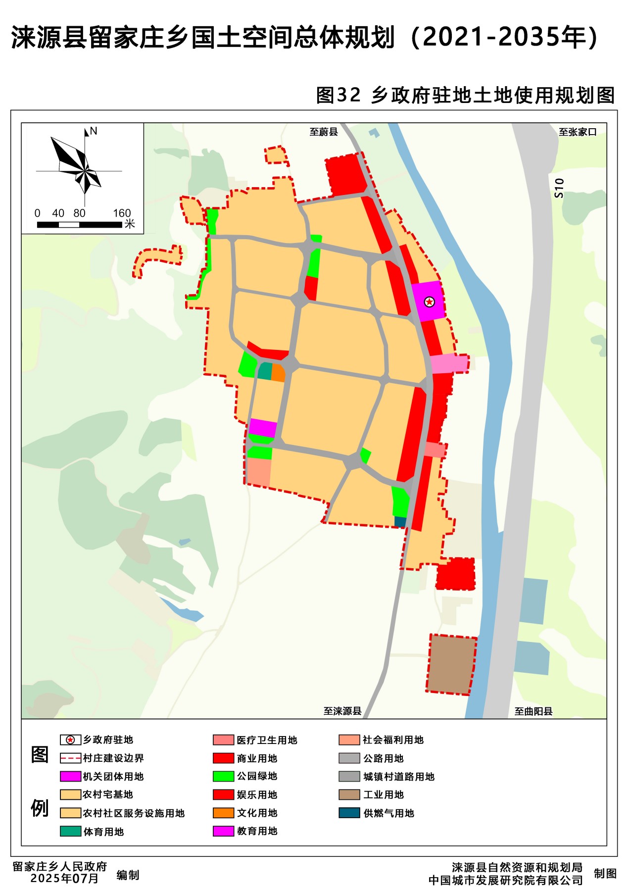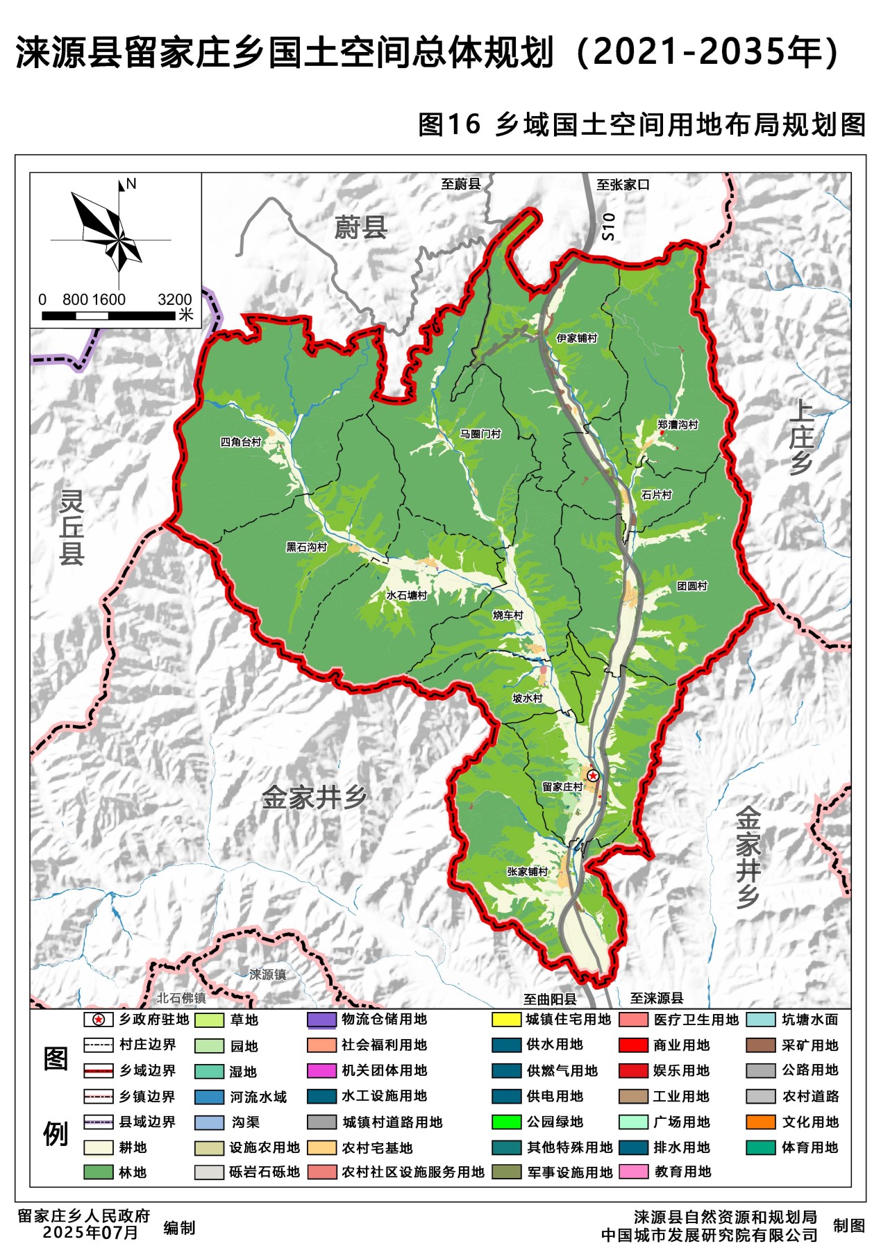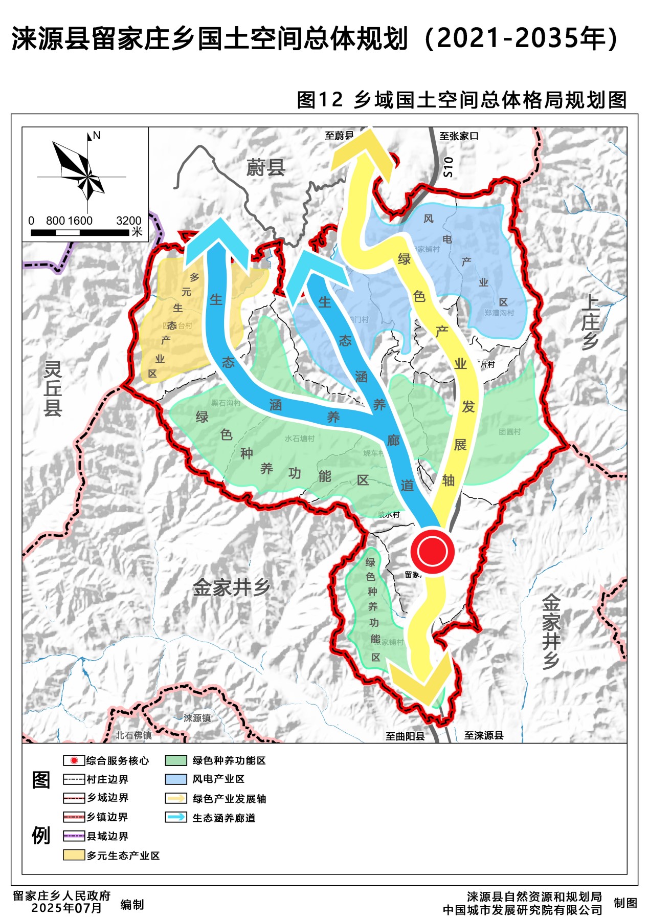 关于《涞源县留家庄乡国土空间总体规划(2021-2035年)》批后公告 《涞源县留家庄乡国土空间总体规划(2021-2035年)》(以下简称《规划》),于2025年7月23日获涞源县人民政府批复(〔2025〕73号)。现根据《中共中央国务院关于建立国土空间规划体系并监督实施的若干意见》(中发〔2019〕18 号)、《中华人民共和国城乡规划法》、《河北省城乡规划条例》、《中华人民共和国政府信息公开条例》等法律法规,现对《规划》成果予以公开。 一、规划期限 2021-2035年 二、规划范围 留家庄乡行政管辖范围,总面积约140.98平方公里,辖12个行政村;本次规划乡政府驻地位于留家庄村,总面积为27.80公顷。 三、乡镇性质 以发展休闲康养、山地农业、生态文旅为主的生态旅游与康养度假特色乡、山地绿色农副产品生产基地、太行山文化传承与研学基地。 四、产业空间布局 结合留家庄乡产业发展方向和生产力布局要求,规划乡以涞蔚公路为主要产业发展轴,带动全乡产业发展,形成“一核一轴三区”的特色产业布局。 一核。以留家庄乡政府所在地为基础,发展山地综合服务及产品集散商贸核心,以公共服务、旅游咨询、山地产品收购、加工、商贸和物流产业为主,带动乡域服务水平及山地产品生产、加工和销售运输发展。 一轴。以贯穿全境的涞蔚公路为支撑,联系留家庄乡域村庄和周边乡镇,是全乡重要的产业协同发展轴。 三区。以张家铺村、坡水村、烧车村、团圆村等为主形成特色林果生产区,主要以核桃、杏仁等特色林果种植为主,大力发展林下经济,带动农业产业向纵深发展。以水石塘村为主形成绿色杂粮生产区,发展方向为推行谷子、荞麦等绿色农业,实施标准化生产,打造高标准杂粮生产区。以伊家铺村、郑漕沟村、马圈门村、石片村为主形成传统坡地作物生产区,重点推动形成以玉米、马铃薯等传统作物种植为主,以适应贫瘠土壤条件的红小豆、黍子等特色作物为辅的传统坡地农业产业体系,提升农业产业化、规模化、市场化水平。 五、乡政府驻地规划规模与空间结构 (一)规划规模 坚持紧凑集约布局,优化提升城镇功能,创造良好人居环境。到2035年,严格控制乡政府驻地范围内村庄建设用地规模不超过27.80公顷。 (二)空间结构 规划形成“一心一带、一环多区”的乡政府所在地空间结构。 一心为乡政府所在地服务核心。依托乡政府、乡级卫生院、乡级商业设施形成城镇服务核心,位于乡政府所在地东部位置,辐射整个乡政府所在地,形成全乡的行政办公、医疗养老、公共活动中心。 一带为马圈沟河景观带,依托南北向流经乡政府驻地的马圈沟河,形成滨河景观带,在保障河流行洪作用的前提下,发挥休闲、观光等功能,与绿地共同构成乡政府所在地的蓝绿网络,结合公共空间塑造滨水休闲景观带。 一环沿乡政府驻地干路形成的城镇发展圈层。突出内外连接与综合服务功能,发挥公共服务与居住功能,沿轴线设置服务乡政府所在地的各类公服与商业设施,提升居民居住环境。沿东部干路设置两侧商业服务带,沿南北环串联多个绿色公园。 多区分别为中部居住片区、北部居住片区、南部居住片区及东部综合服务片区。居住片区内集中设置各类文化、教育、医疗设施,发挥集中的公共服务功能。同时结合居住片区现代化改造,完善各类服务配套设施,实现乡政府所在地居民安居乐业。