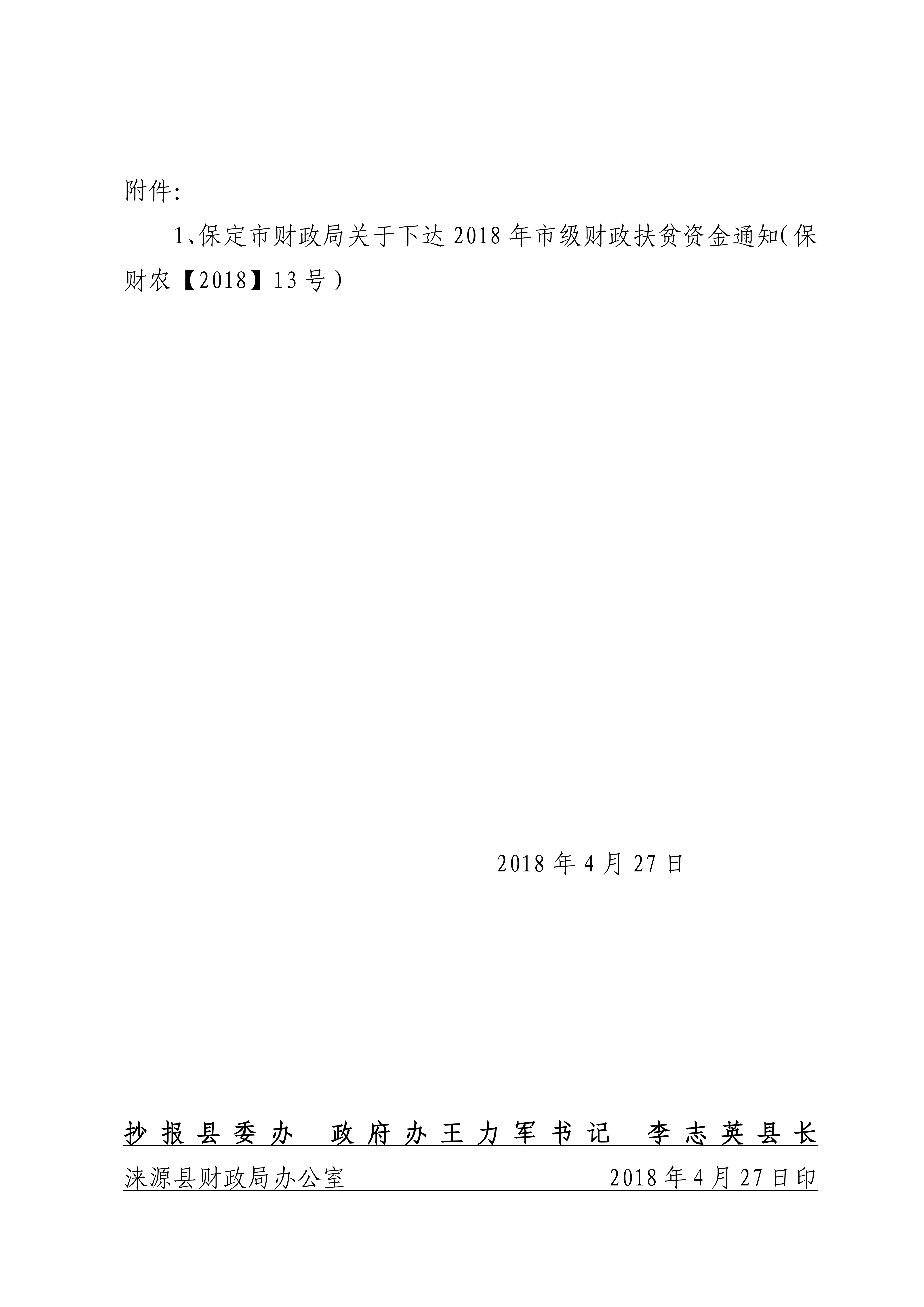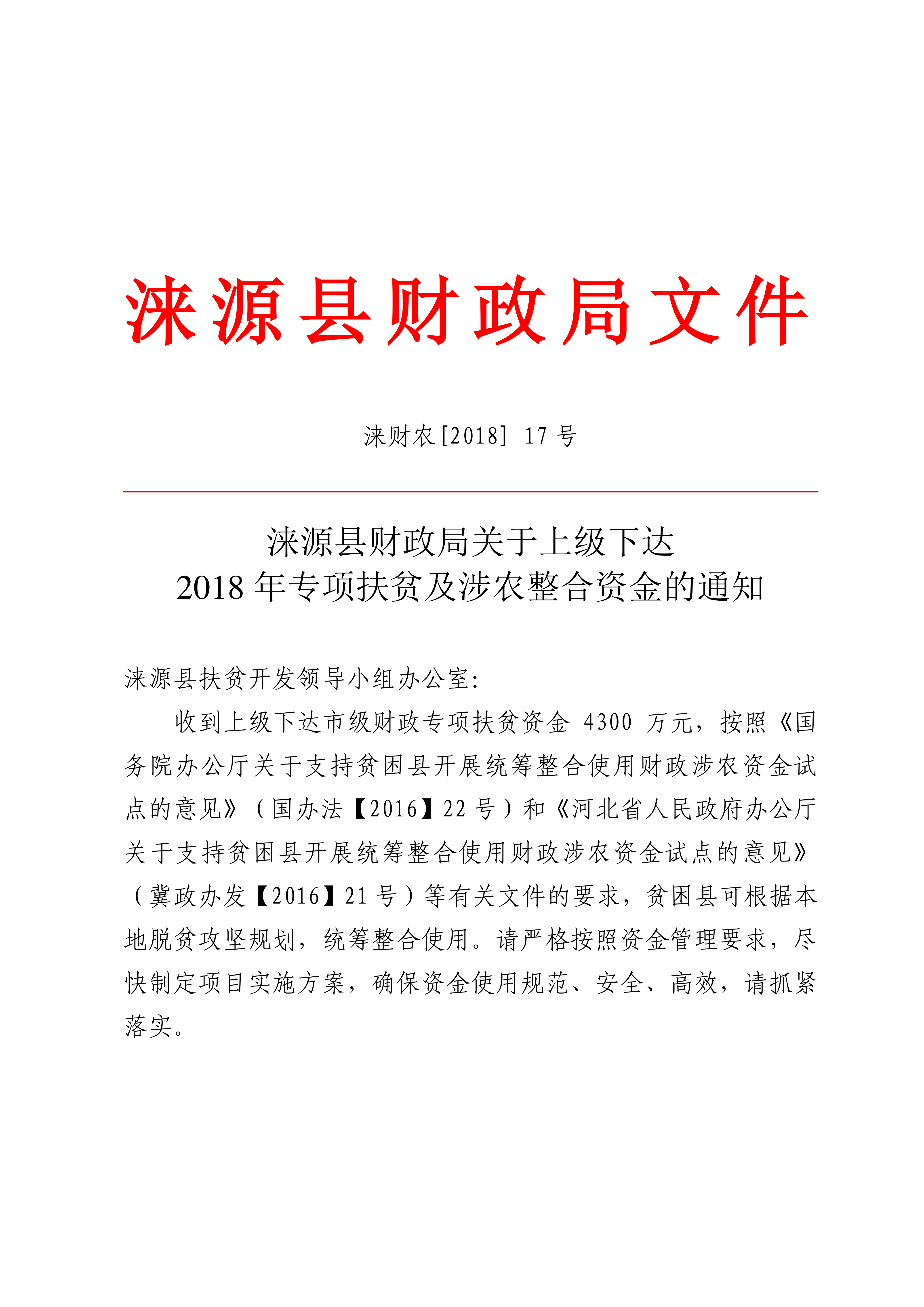 涞源县财政局关于上级下达2018年专项扶贫及涉农整合资金的通知