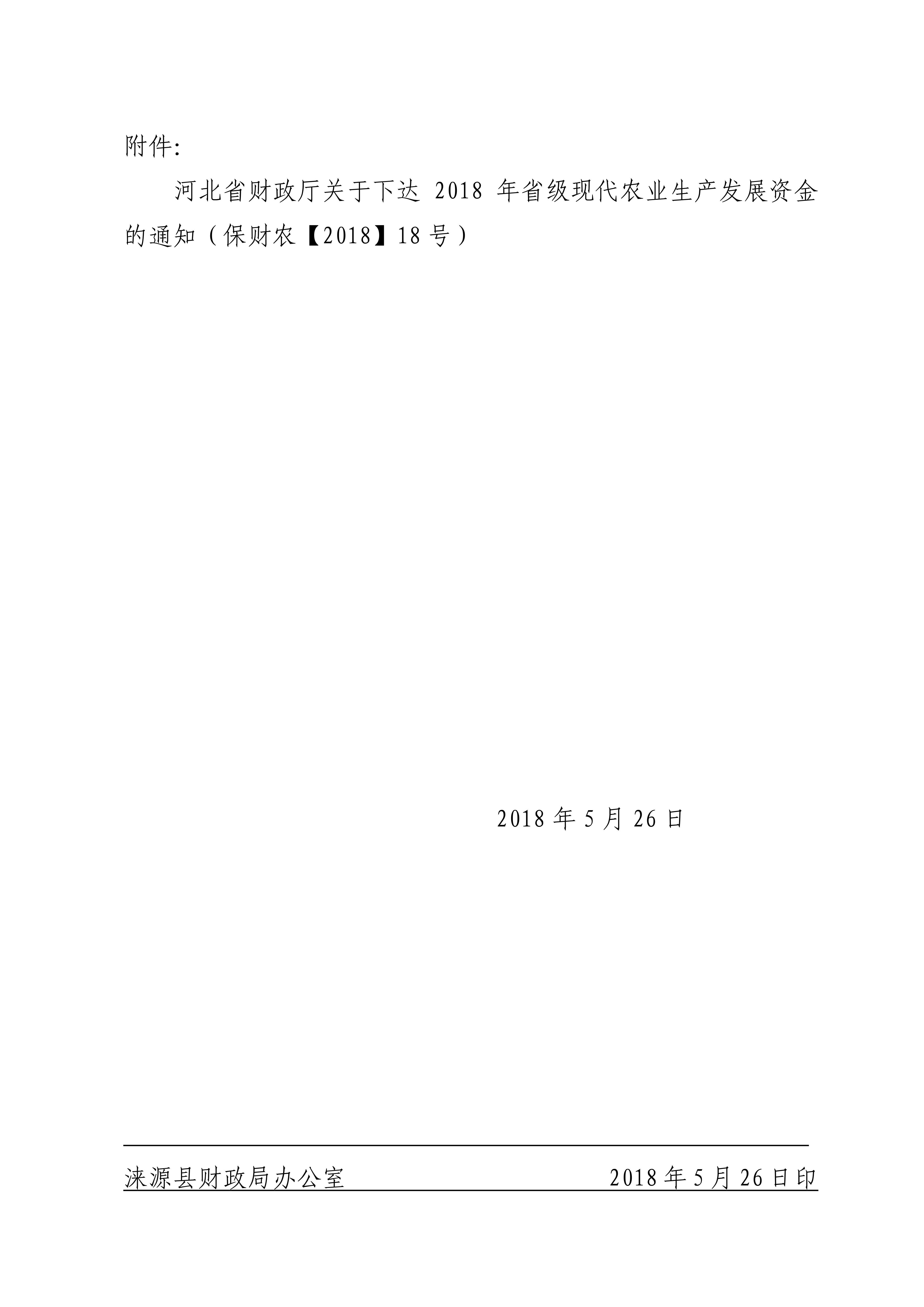 涞源县财政局关于上级下达2018年专项扶贫及涉农整合资金的通知