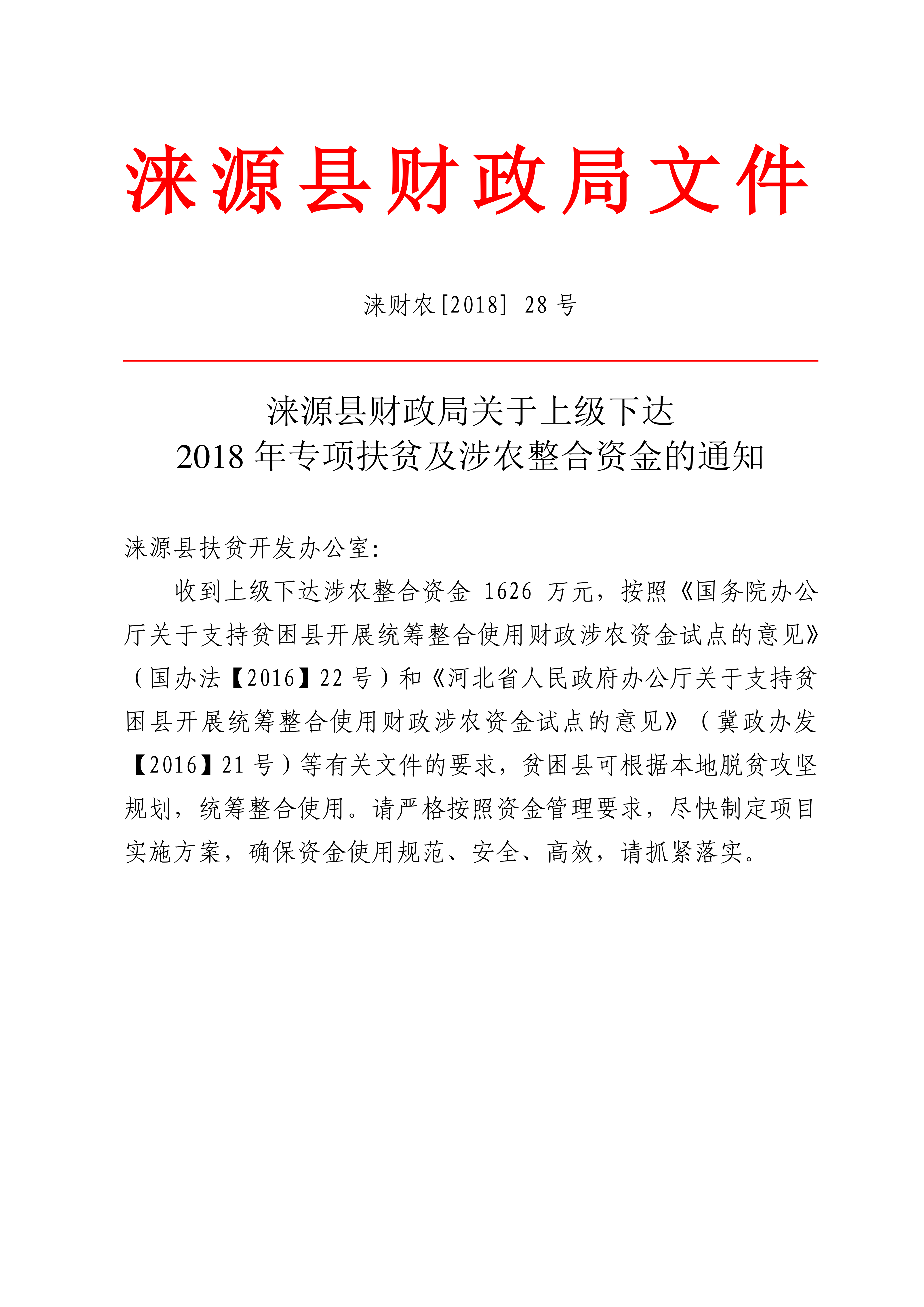 涞源县财政局关于上级下达2018年专项扶贫及涉农整合资金的通知