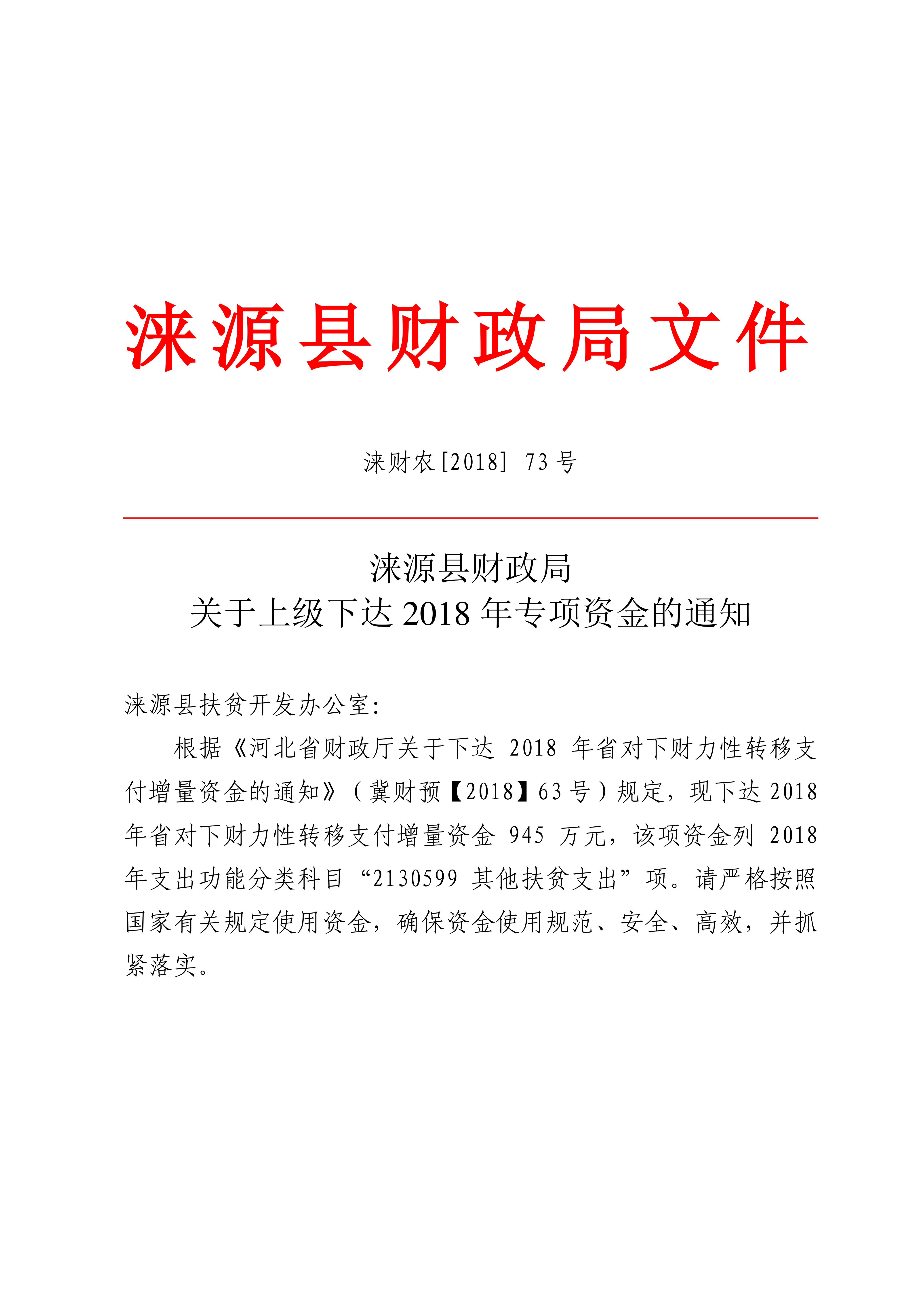 涞源县财政局关于上级下达2018年专项资金的通知