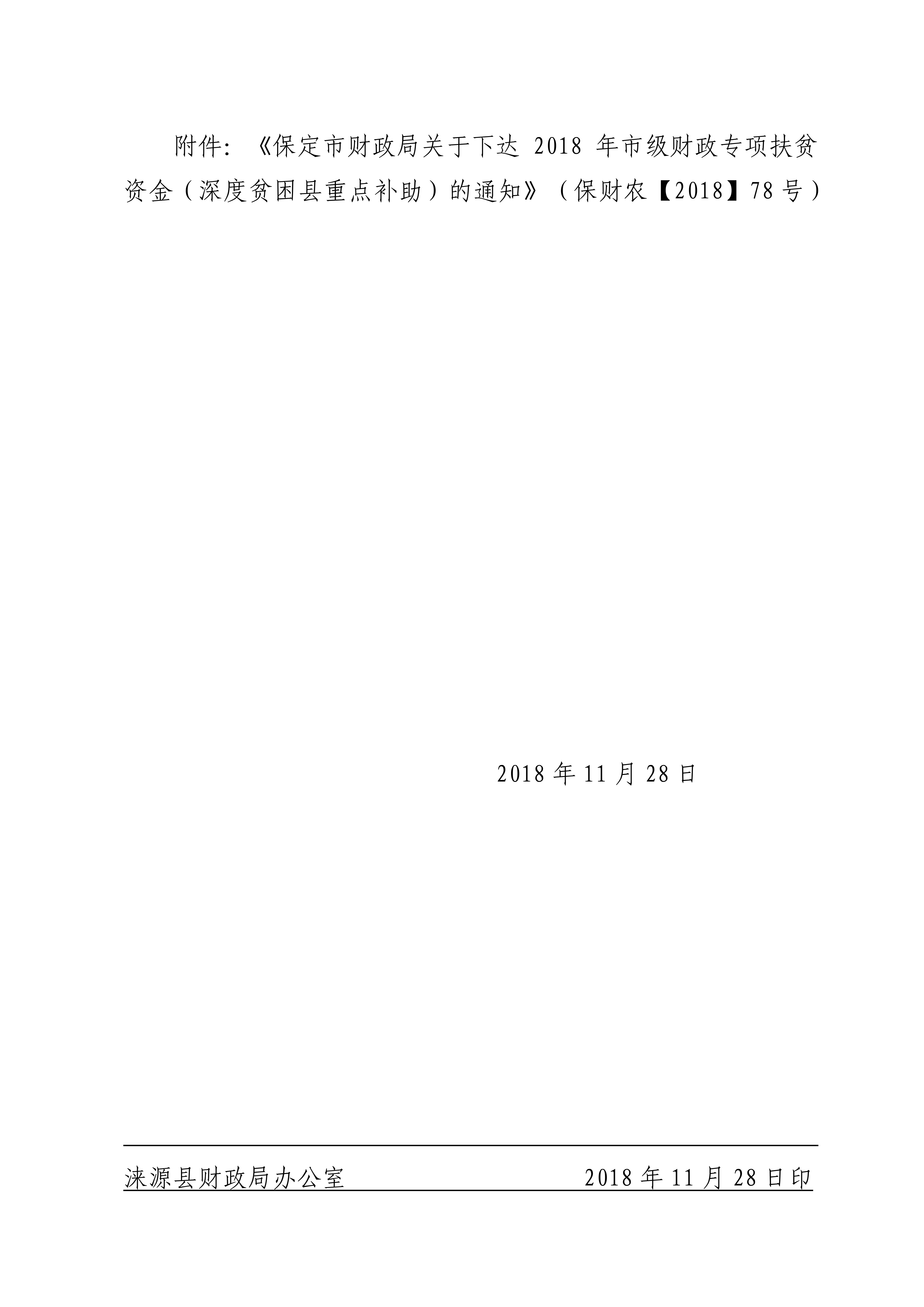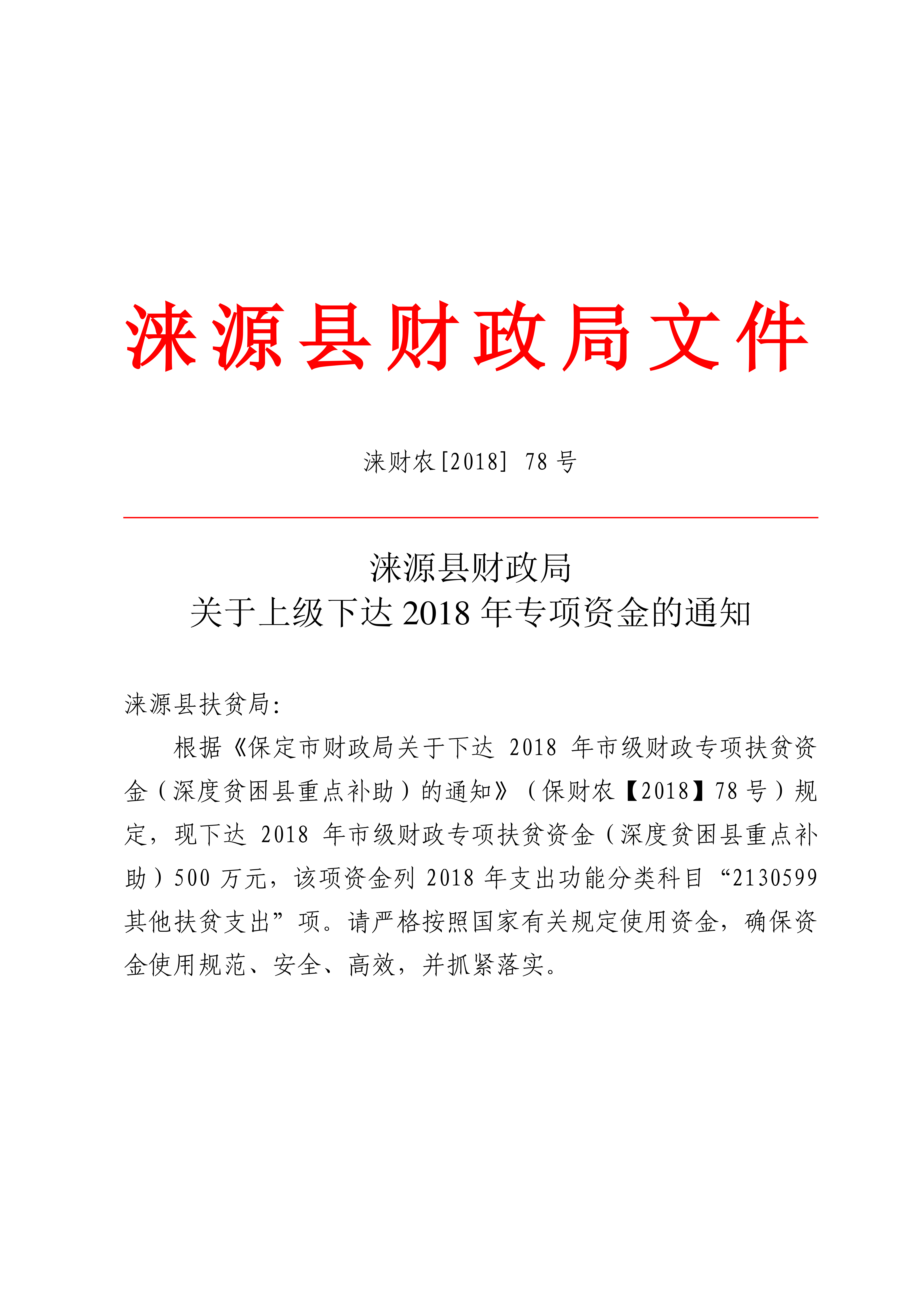 涞源县财政局关于上级下达2018年专项资金的通知