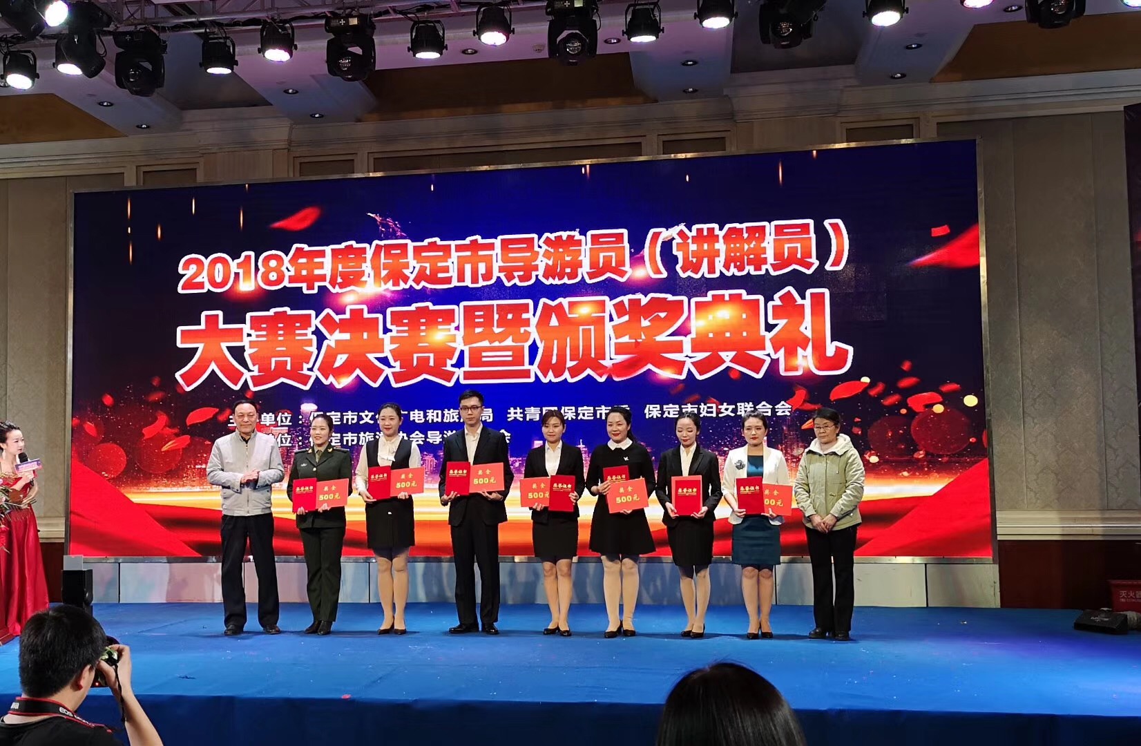 经过一天紧张激烈的角逐和专业的评分,王米雪以过硬的讲解水准,亲和的感染力,扎实的知识储备,以及出色的才艺表演赢得了台下评委们的一致认同,获得总分90.12分位居第四,被授予“保定市十佳金牌导游员”称号。
