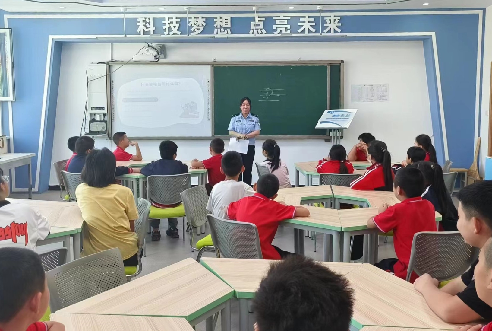 宣讲现场,宣讲民警紧紧围绕着未成年人保护、预防未成年人犯罪、反诈防骗、防范校园欺凌等内容,用一个个鲜活案例,以案释法、以法示警,用浅显易懂的语言引导在校师生要冷静处理日常学习生活中的矛盾,教育引导学生们提高自我保护意识,自觉抵制各种不良行为,做到学法、知法、守法,懂得用法律武器保护自身合法权益,警校携手、共同营造和谐美好的校园法治氛围。 反诈宣传进课堂 携手守护钱袋子 随着社会的发展、互联网的普及,一些诈骗分子将矛头指向思想单纯、社会经验不足的学生。为进一步增强广大师生对电信网络诈骗的“免疫力”,反诈中心民警深入校园化身反诈教师,送上生动有趣的反诈防骗课。