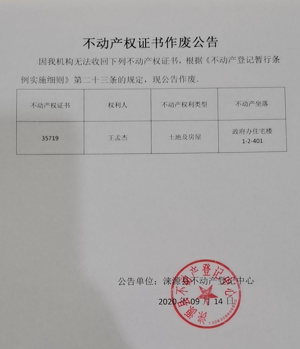 涞源县不动产登记中心公告