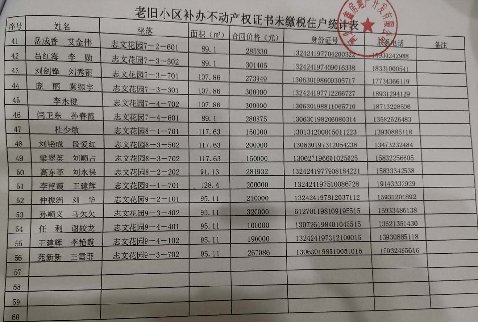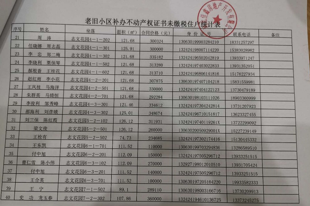 涞源县老旧小区补办不动产权证书未缴税住户统计表