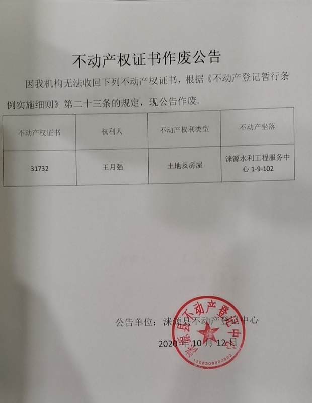 涞源县不动产登记中心公告