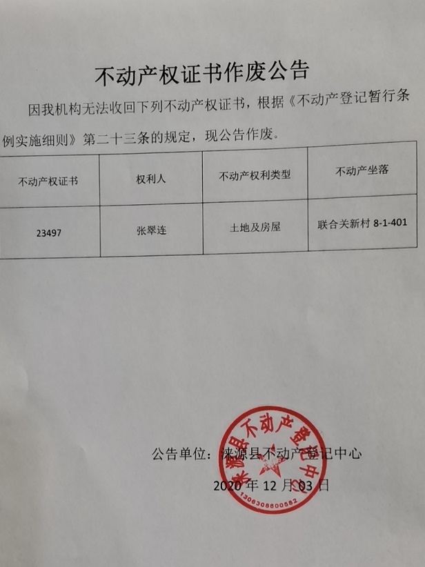 涞源县不动产登记中心公告
