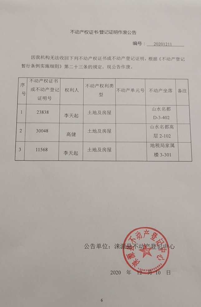 涞源县不动产中心公告