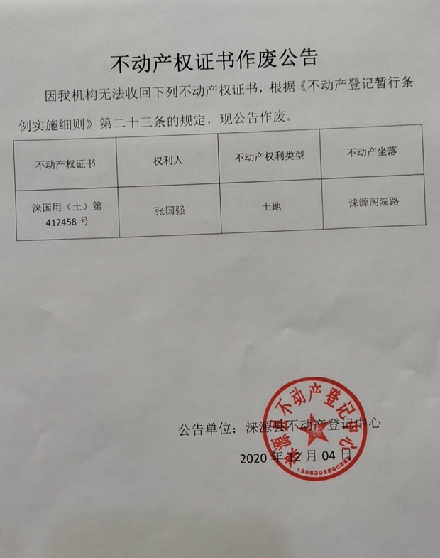 涞源县不动产登记中心公告