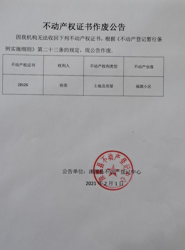 涞源县不动产登记中心公告